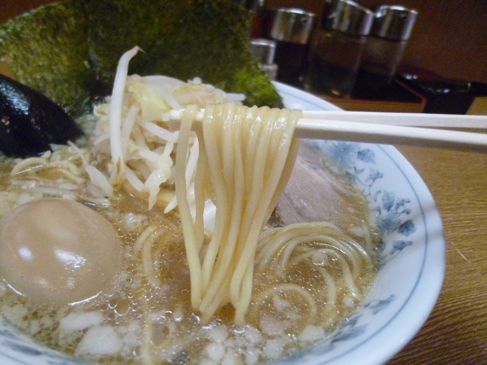 背脂が目立つスープはほどほどにオイリーでちょっと甘めな豚骨醤油。ライトめなとんこつに調味料で甘みを利かせ脂で力を演出しているのが分かります。