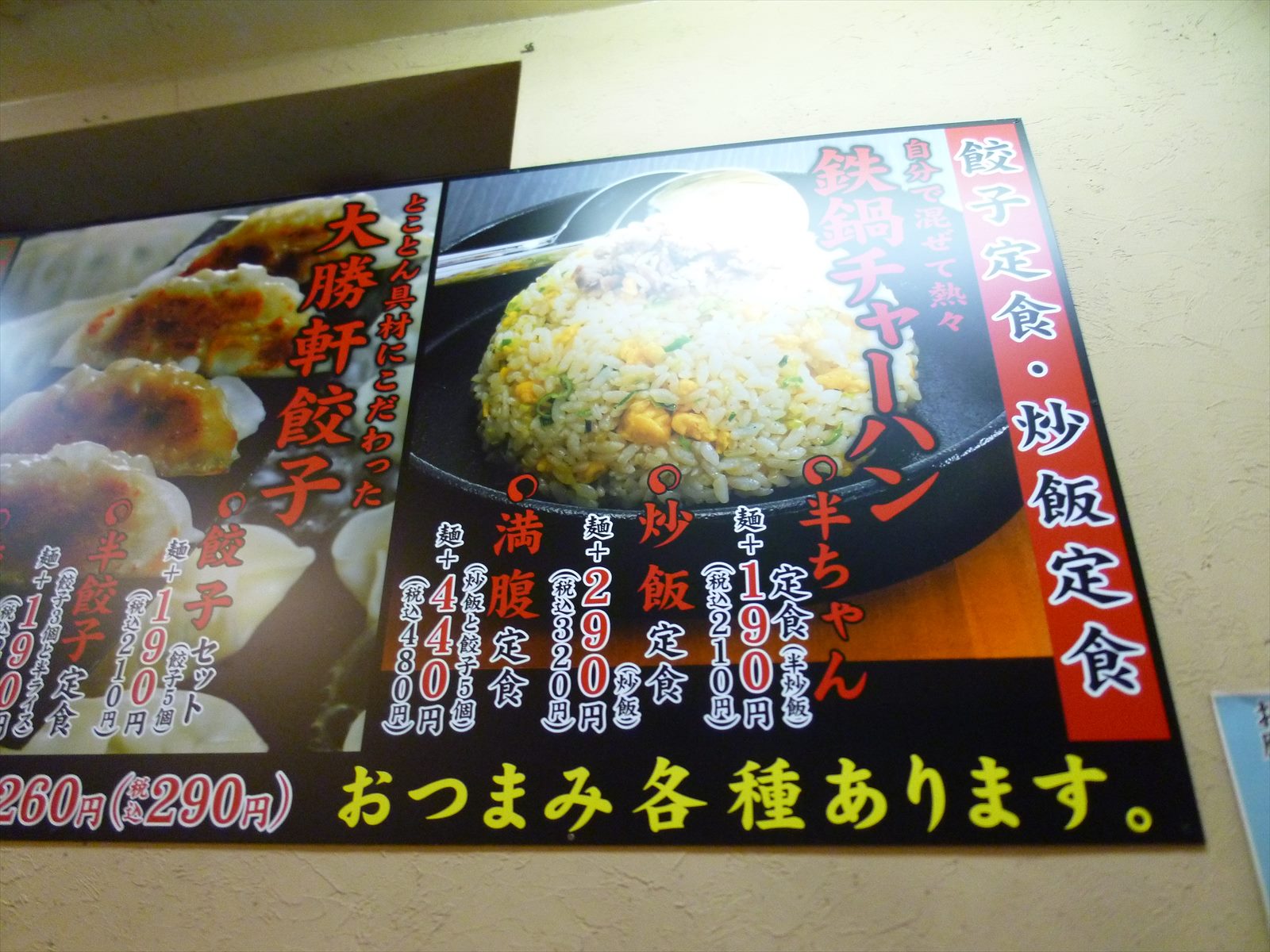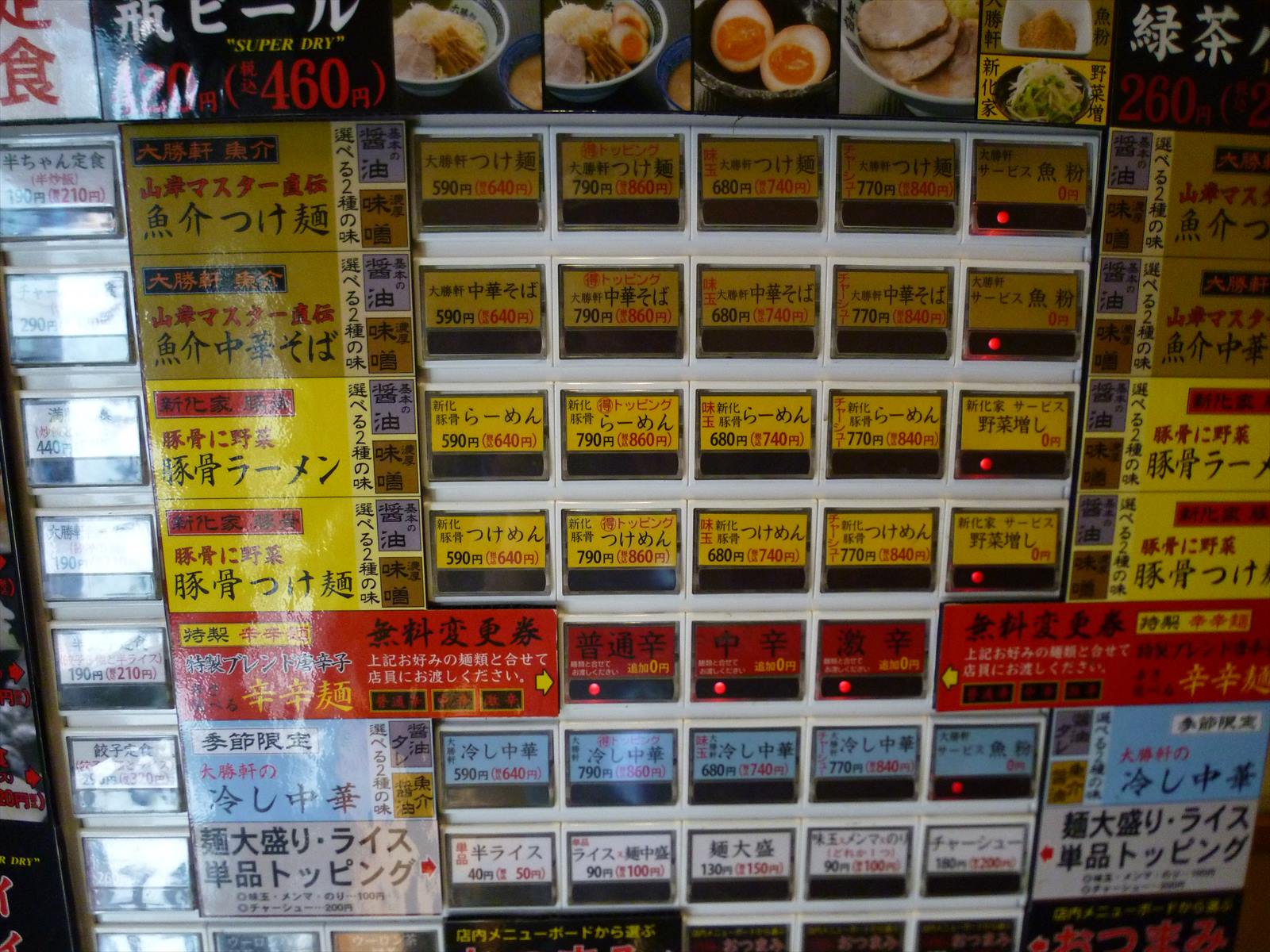 入って左にある券売機。あくまでトップは大勝軒のつけ麺みたいだけど定食ものやちょい飲み系のメニューも増やしてみたりといろいろ始めてました。