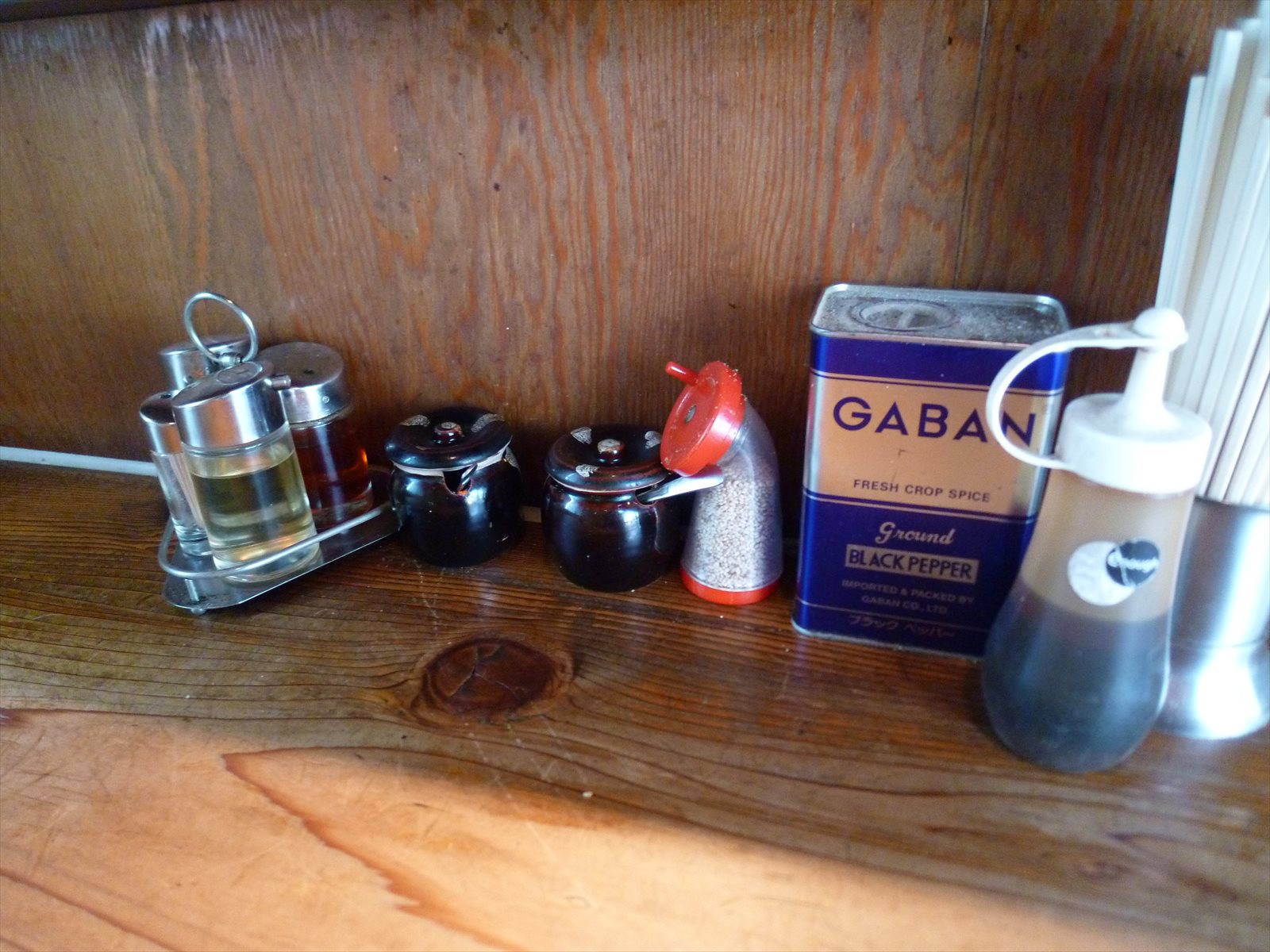 卓上調味料は家系標準な仕様になりましたがにんにくは緑で行者にんにくっぽいです。