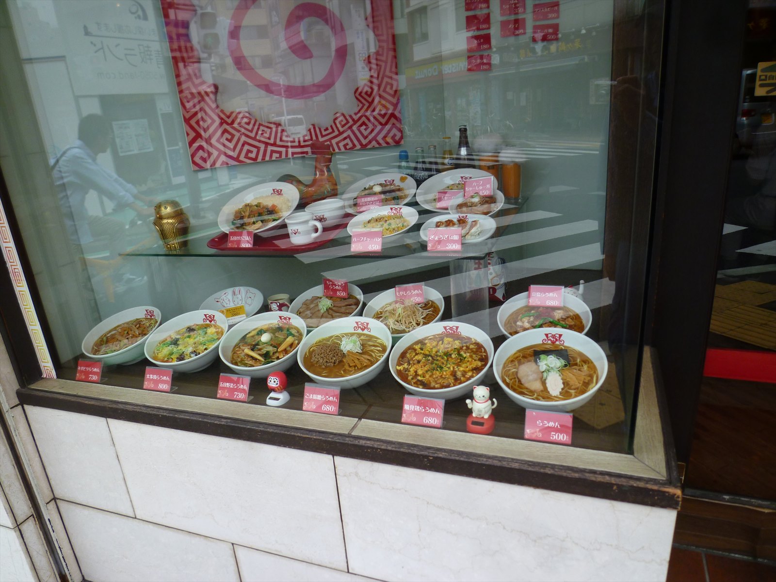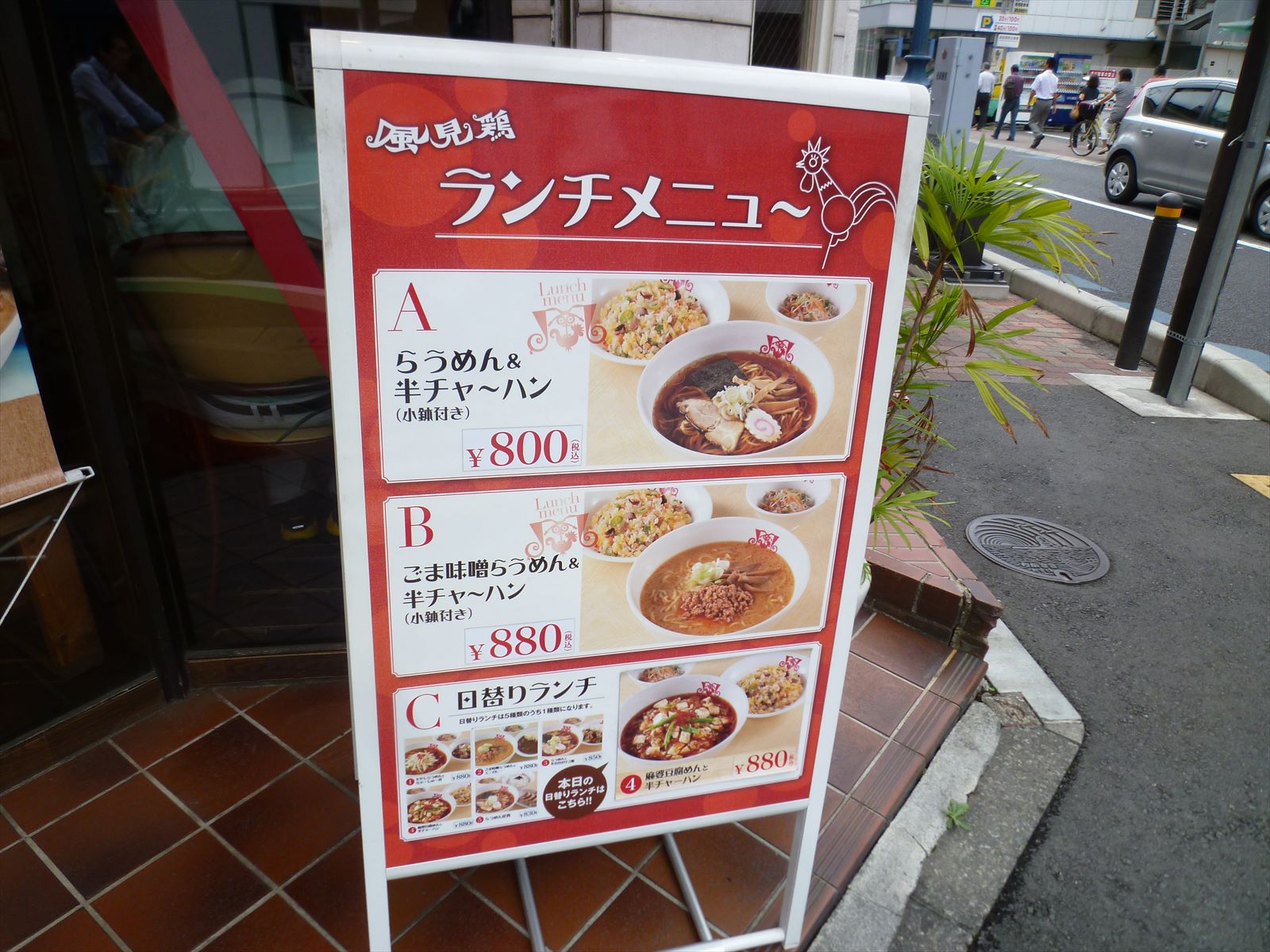 店頭では期間限定の垂れ幕の近くにランチセット。先に言っちゃいますがけっこうな男性客がセットを頼んでいるように見られました。半チャンラーメンは定番だもんね。