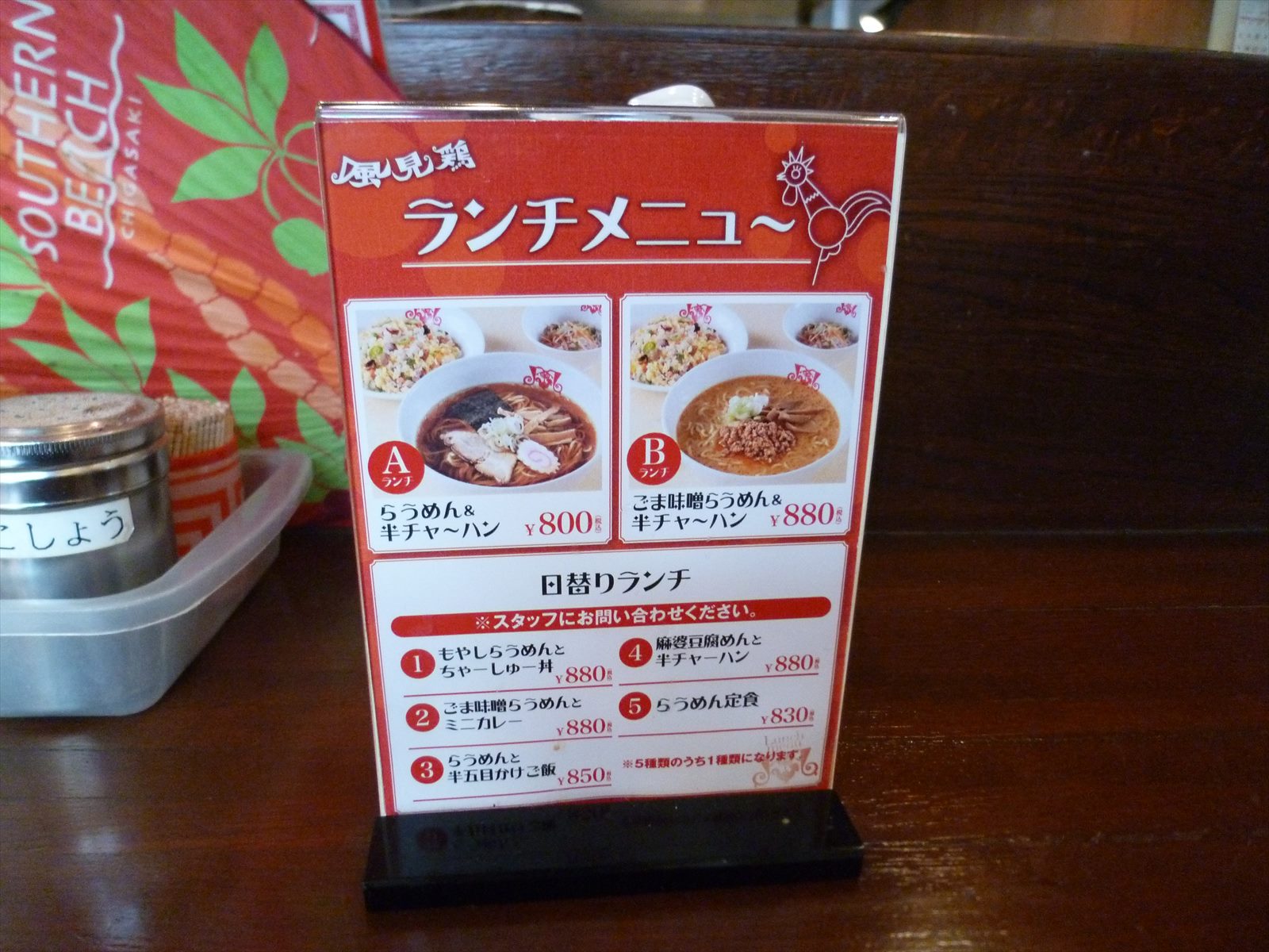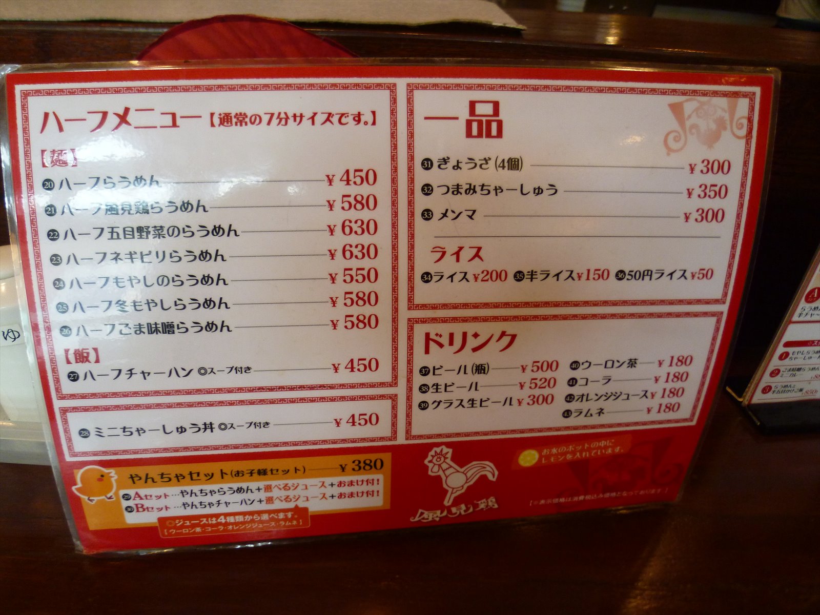 卓上にもランチセットの案内があります。ランチには半ライスのサービスもやってたりしますがどこにも告知がないのがもったいないかな。