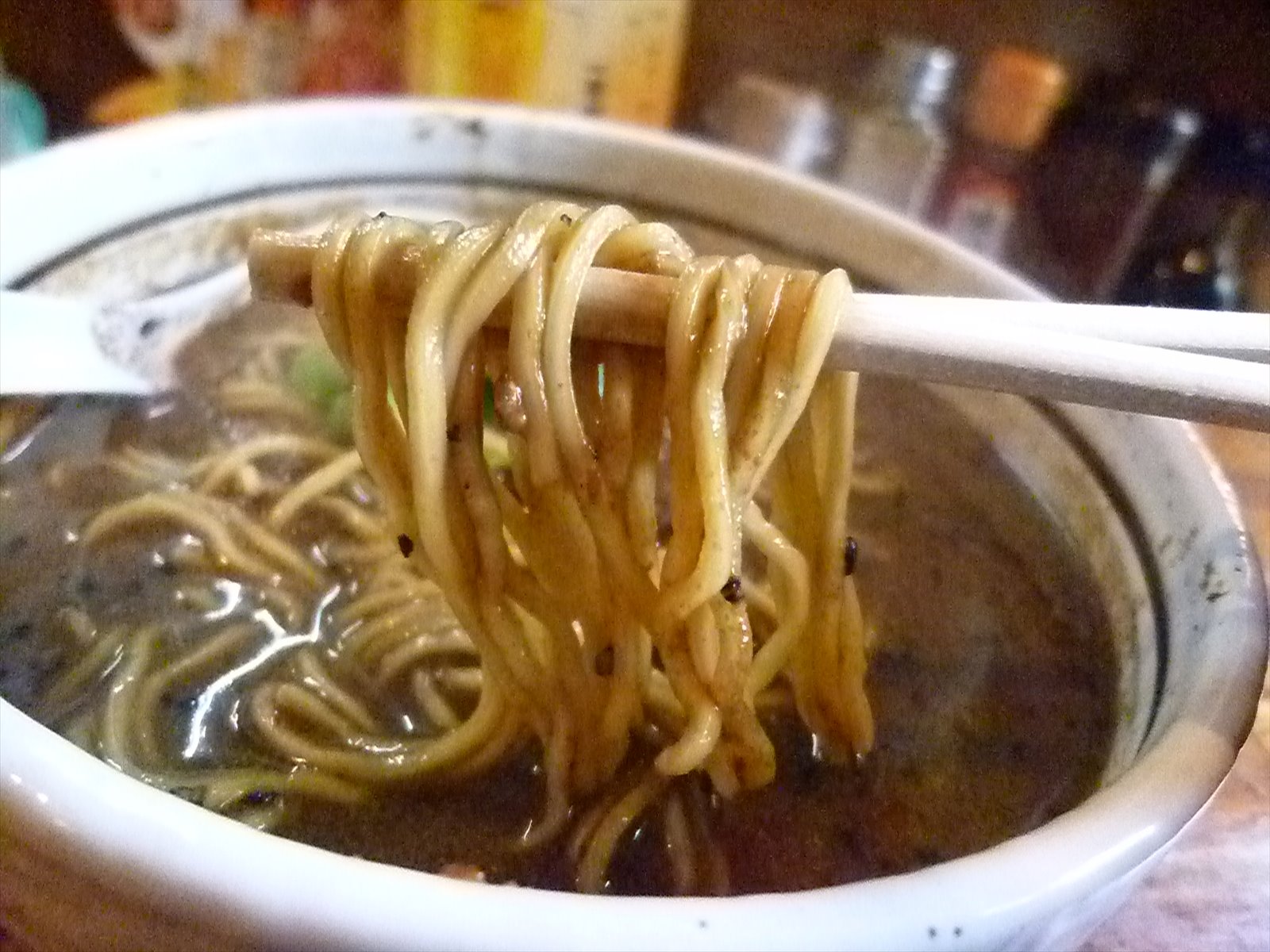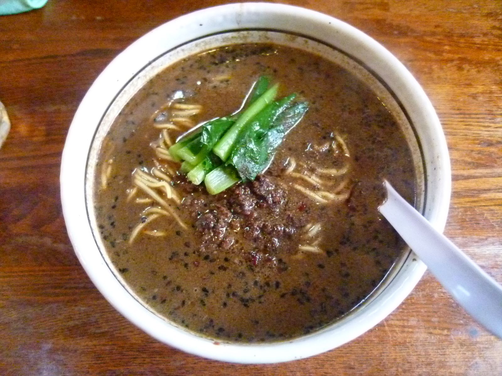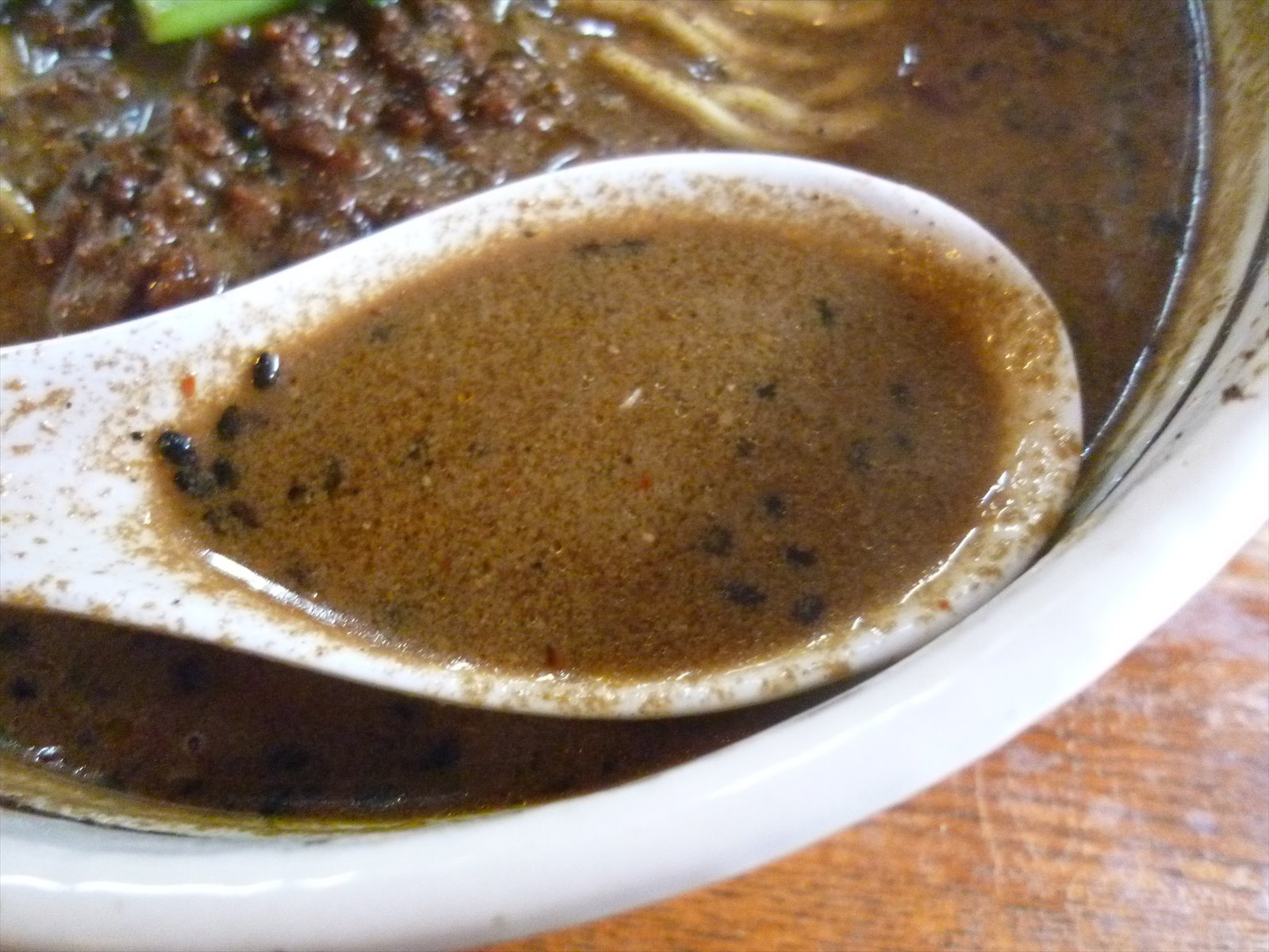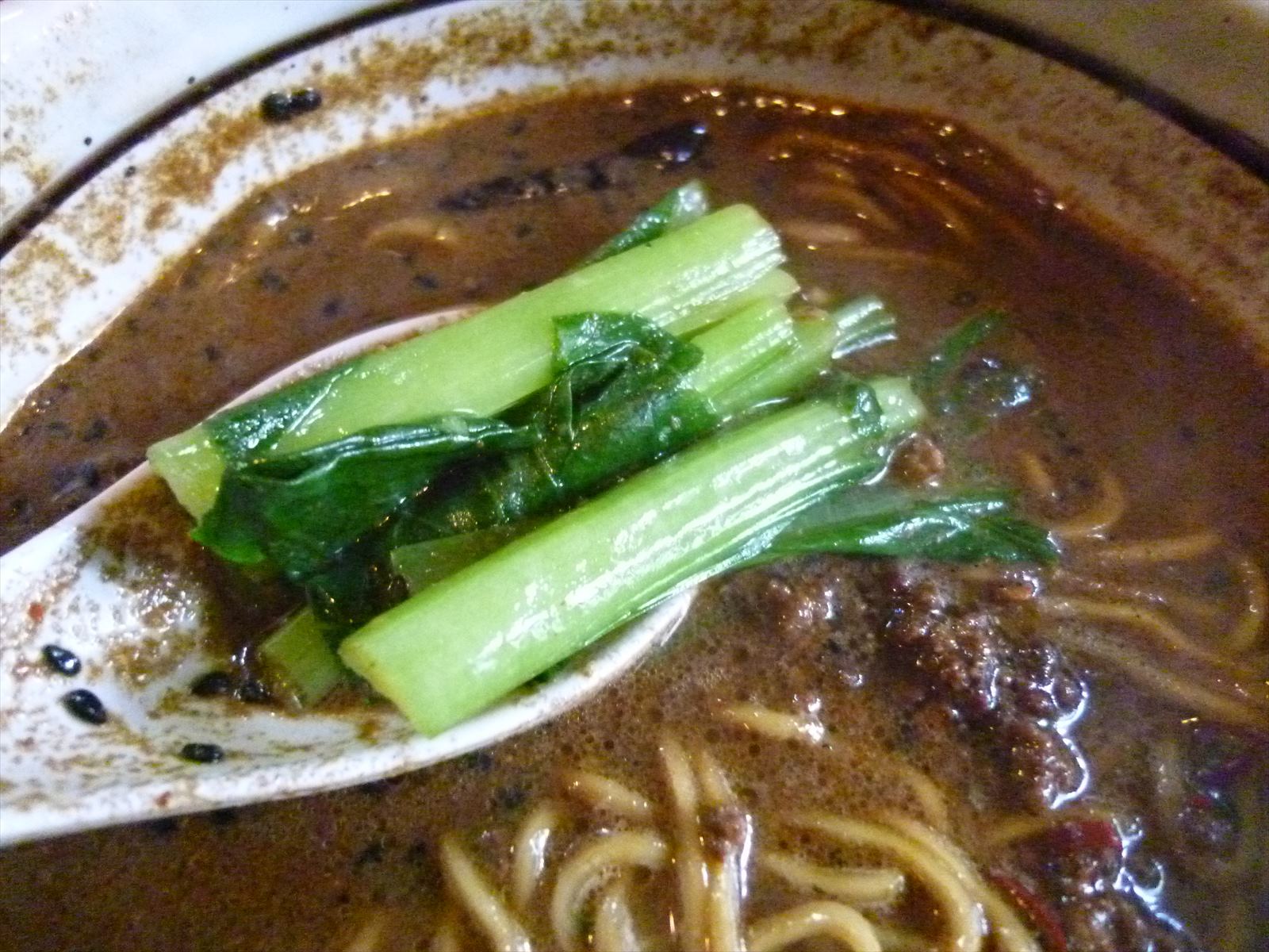見た目に反してさらりとした口当たりで多くの黒ゴマが見えるスープ。味の方はこれまた見た目に反してゴマよりもむしろ山椒由来の痺れの辛さが前に立ってスパイシー。唐辛子的な辛さは仕込んである輪切りの鷹の爪からじわじわ染み出て初めはほとんど感じませんが食べるにつれてじわじわとピリピリしてきます。