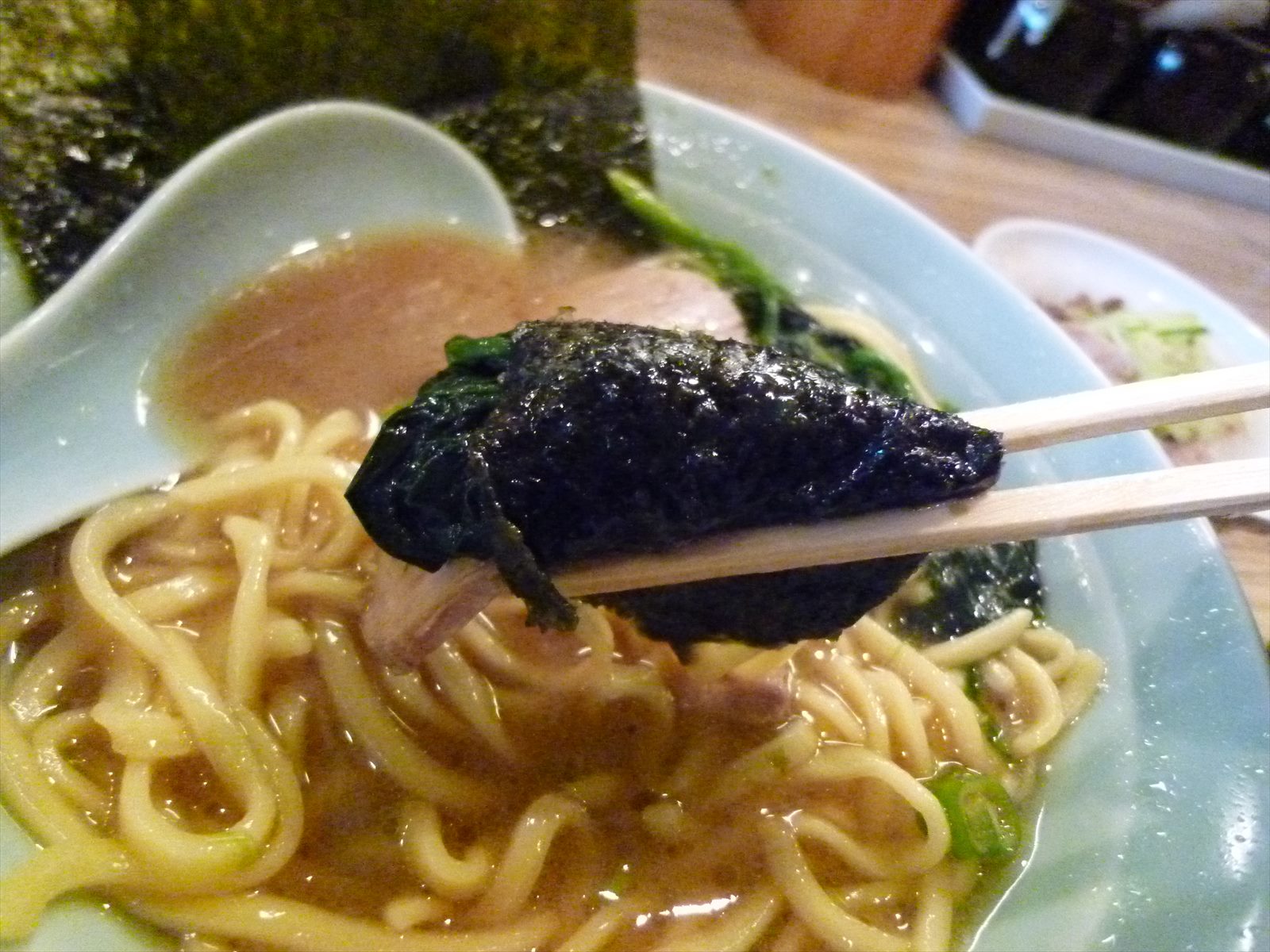 筋に沿えば箸でも千切れるチャーシューにほうれん草を添えてとんこつ醤油を染みこませた海苔で巻く。麺は入れなくてもこんな楽しみ方って家系でしかできないと思う。