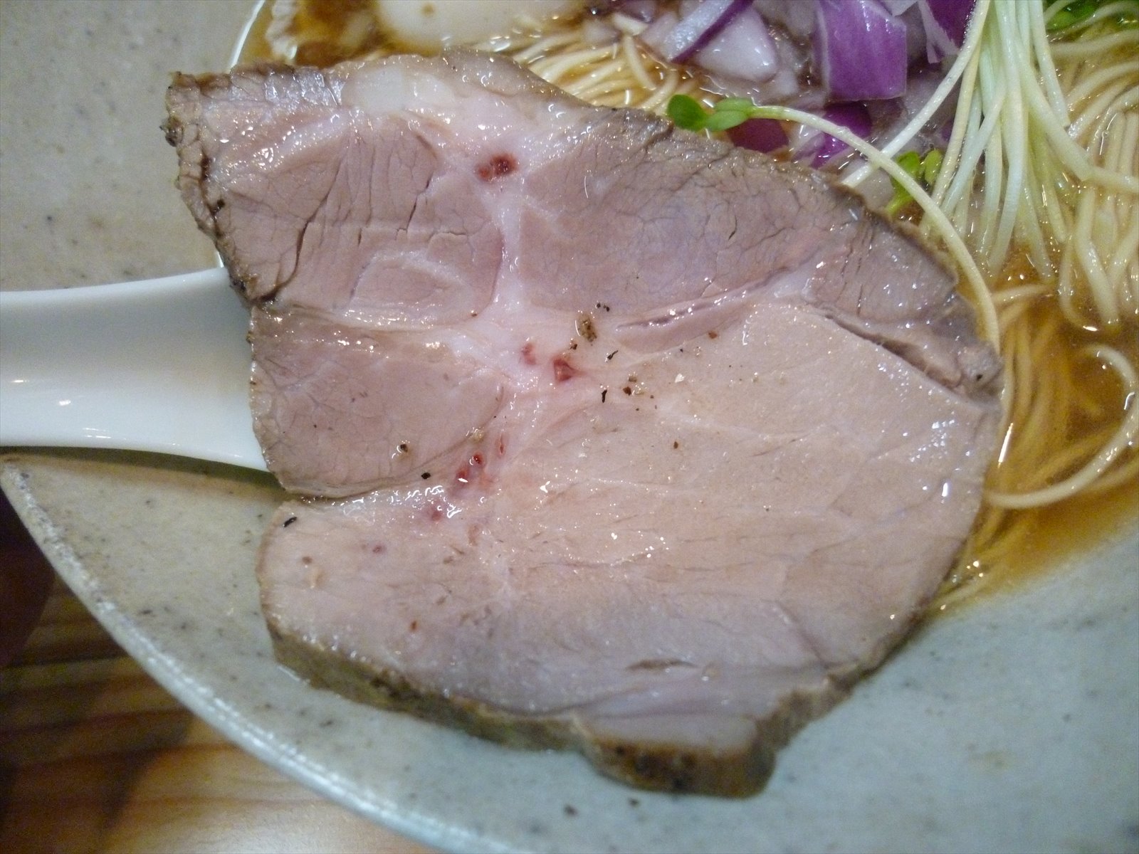 チャーシューは3ミリほどの厚みがある低温調理の大判ロース。脂じゃないホントの意味の肉汁がちょっと強めな塩気を連れて噛み応えのある肉から染み出てきて。