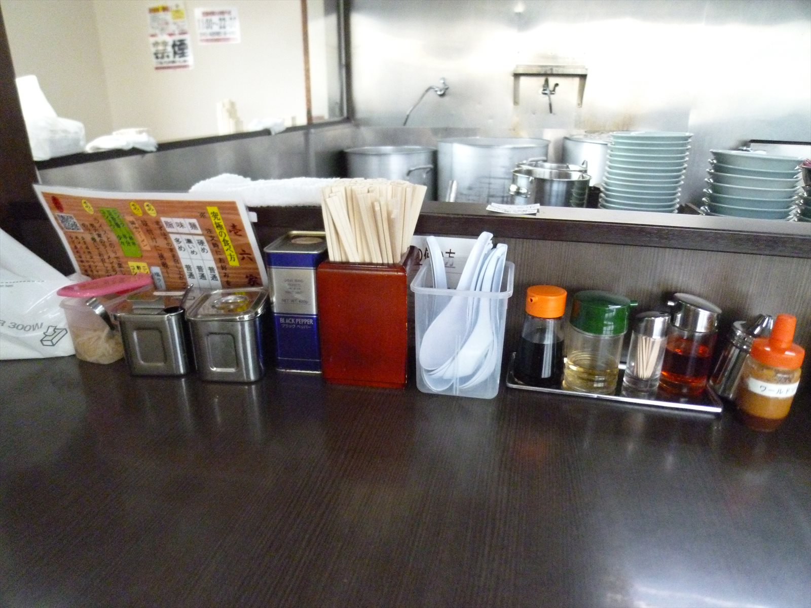 卓上にはずらっと並んだ調味料。冷蔵ケースの上には紙エプロンも用意されています。