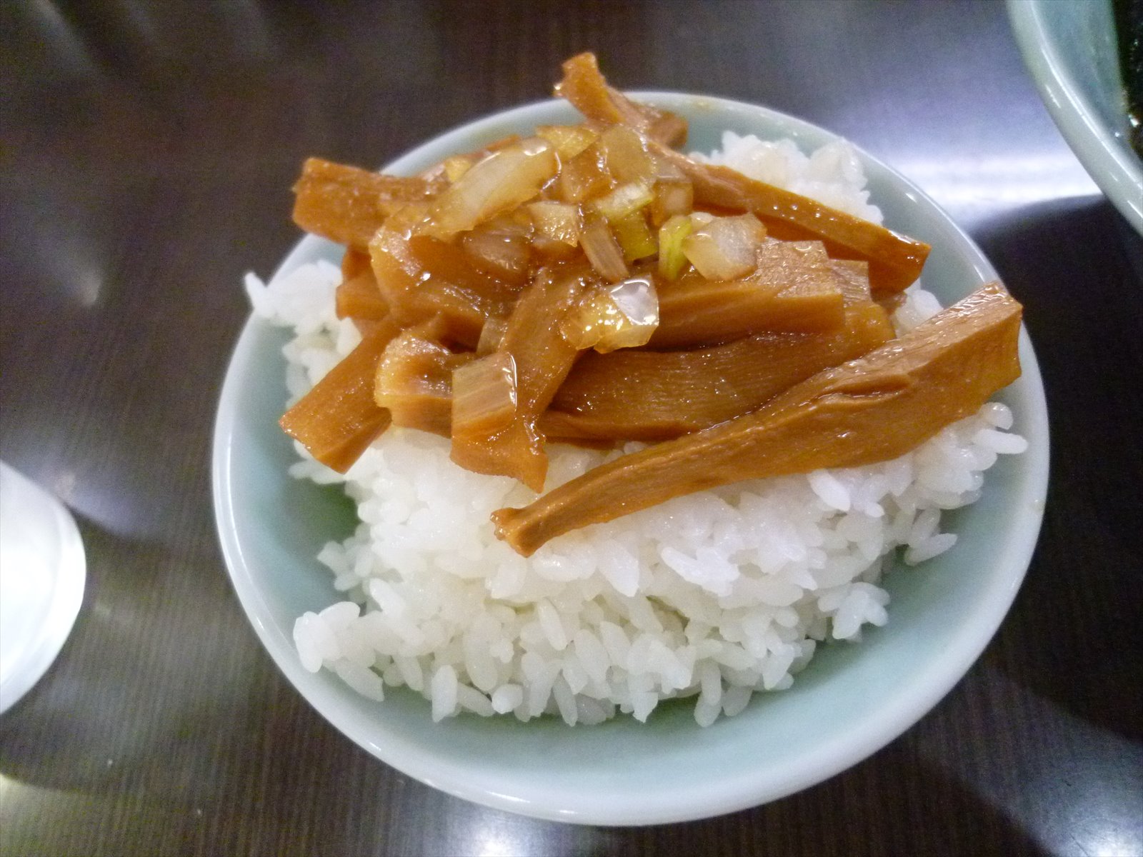 これには普通に食ったら余っちゃったメンマを乗っけてスープの熱に味を帯びた玉ねぎをあしらって我流のメンマ丼。おかずになるメンマで飯をかっ喰らうのも一興ってなもんで。