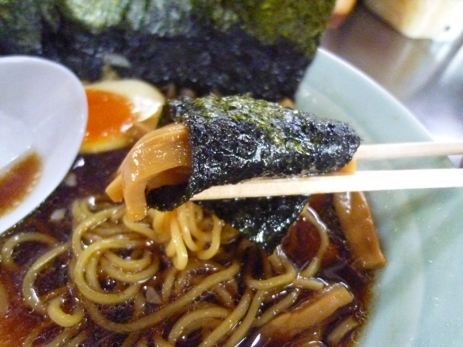 およそ家系のお店とは思えない清湯ベースに真っ黒醤油。醤油の風味こそ強く立ってるんですが塩分的にはそれほどでもなくむしろ油の主張の方が強いくらいに感じます。初めちょい辛だんだん甘くなる刻み玉ねぎがいいカンジのアクセントでシャクシャクの歯ごたえがあとを引く引く。