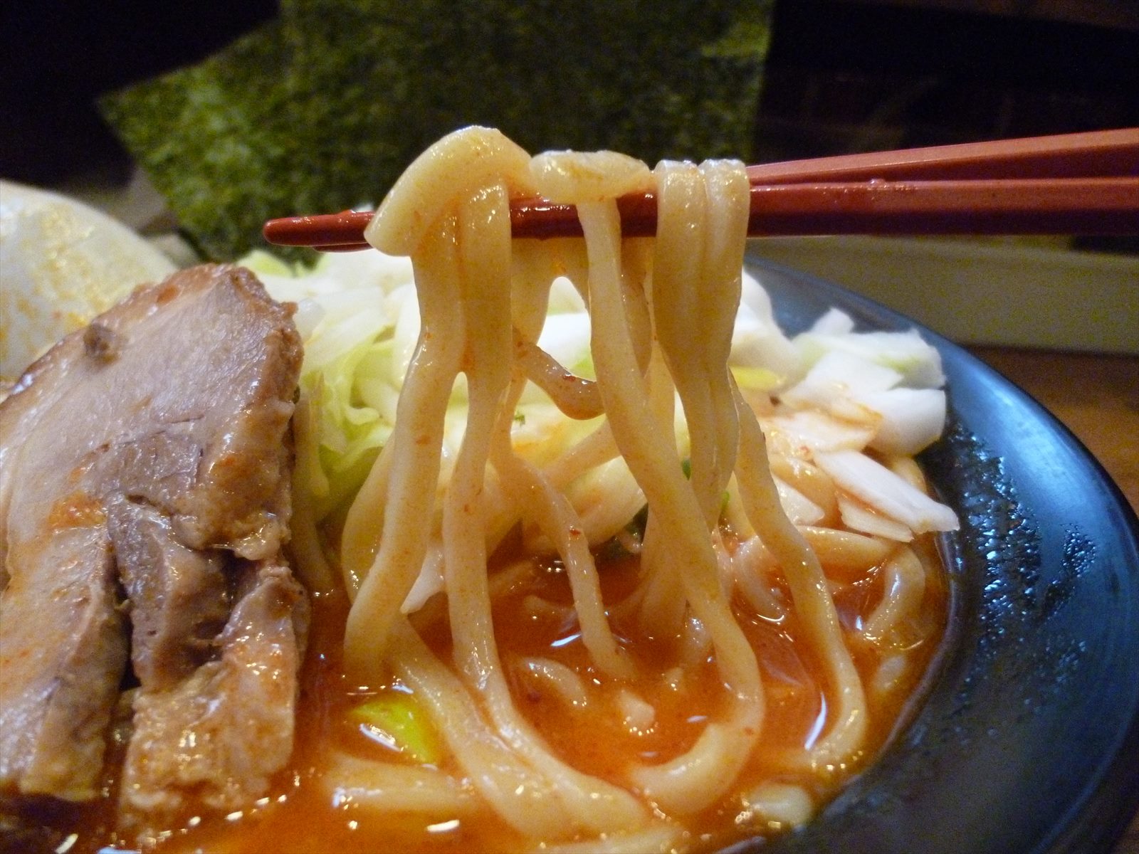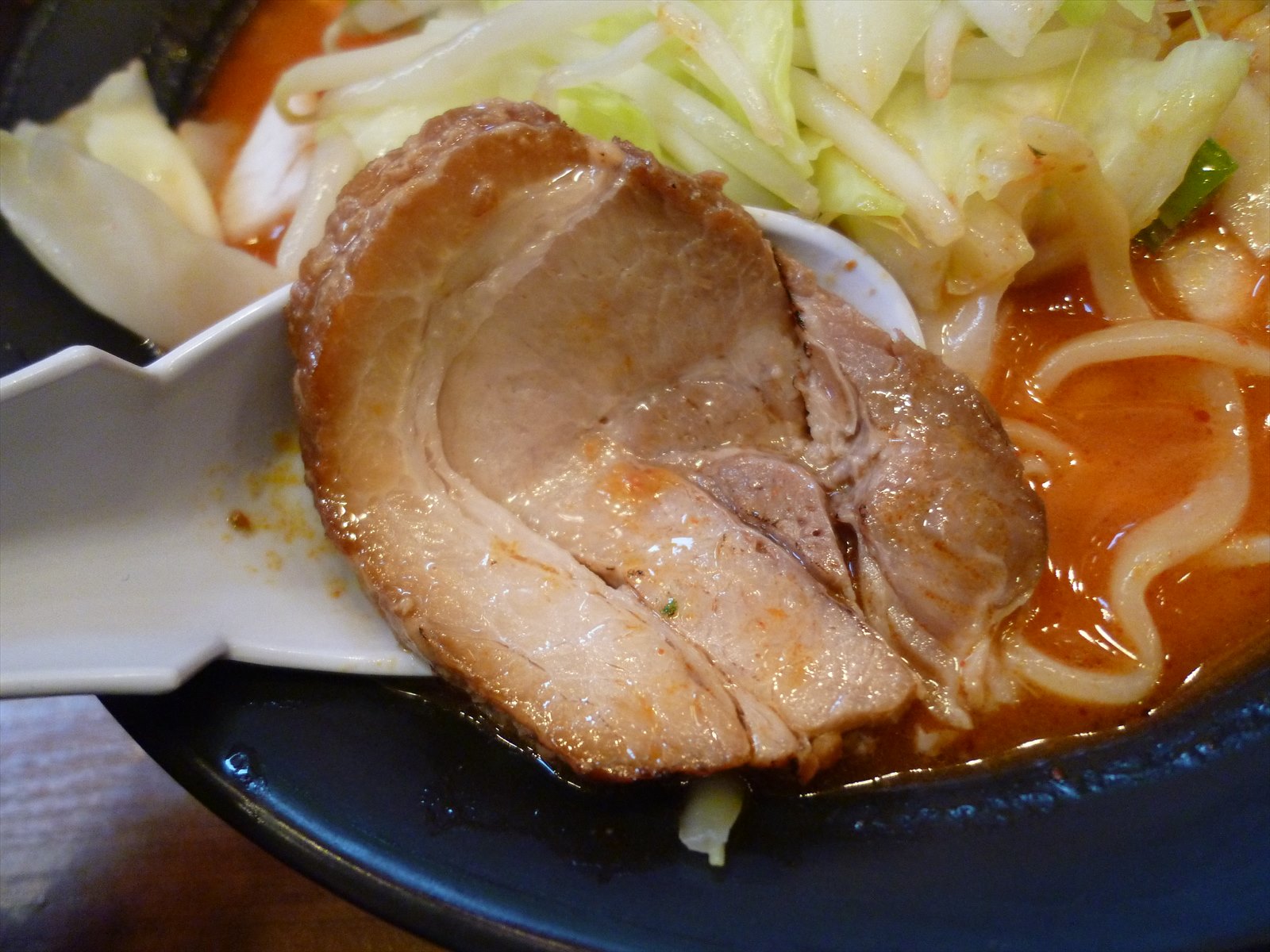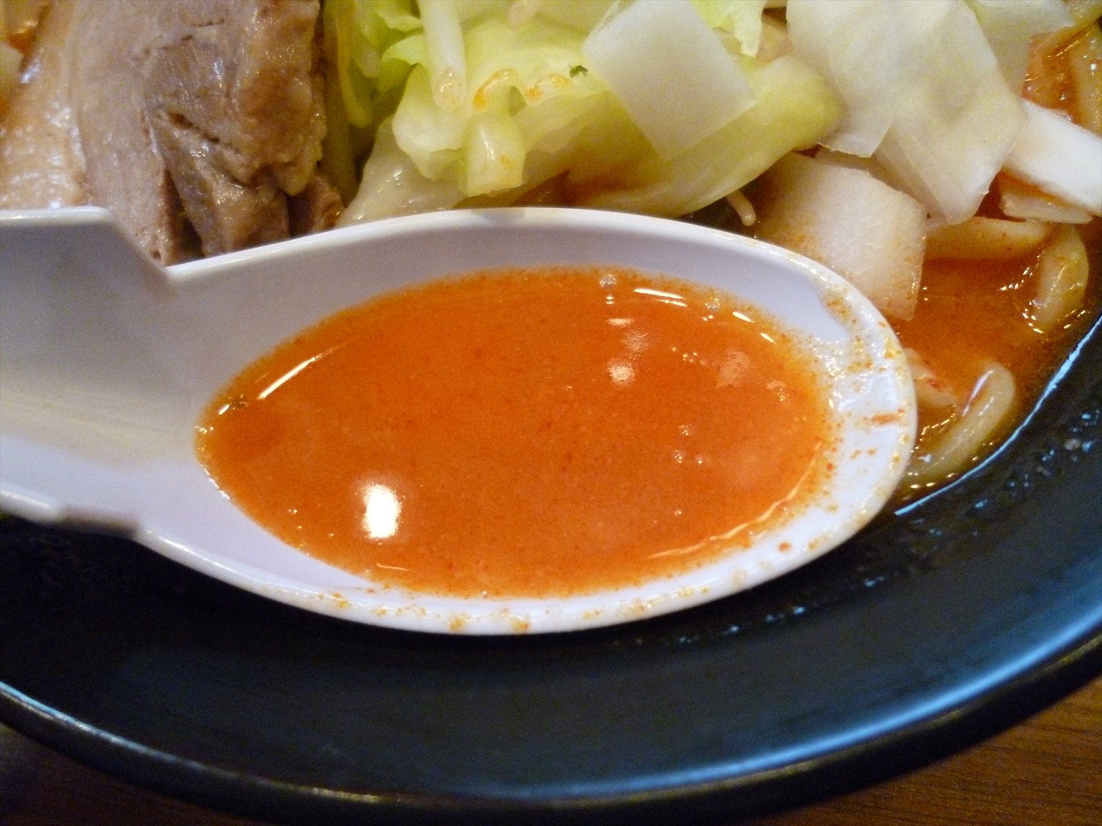 赤というか朱色ですかね。商品名にしてるくらいだからハバネロ使用なんでしょうが豆板醤使用のスープのように塩分が加わっている印象はなく唐辛子らしい風味とビリビリとした辛さが舌にきます。うおっと、これは紛うことなき激辛だね。ギリギリなとこ来ちゃったよ。