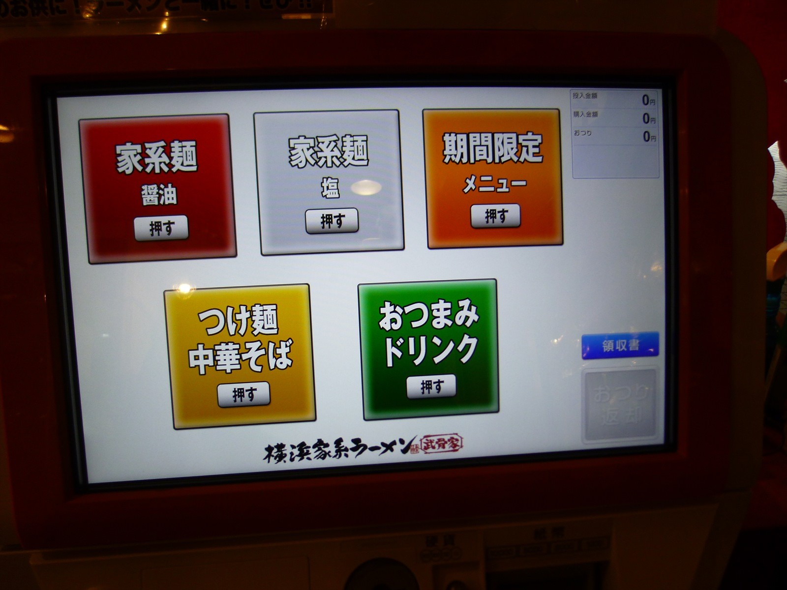 入って右にある券売機。オレンジのボタンに触れて次へ進みます。