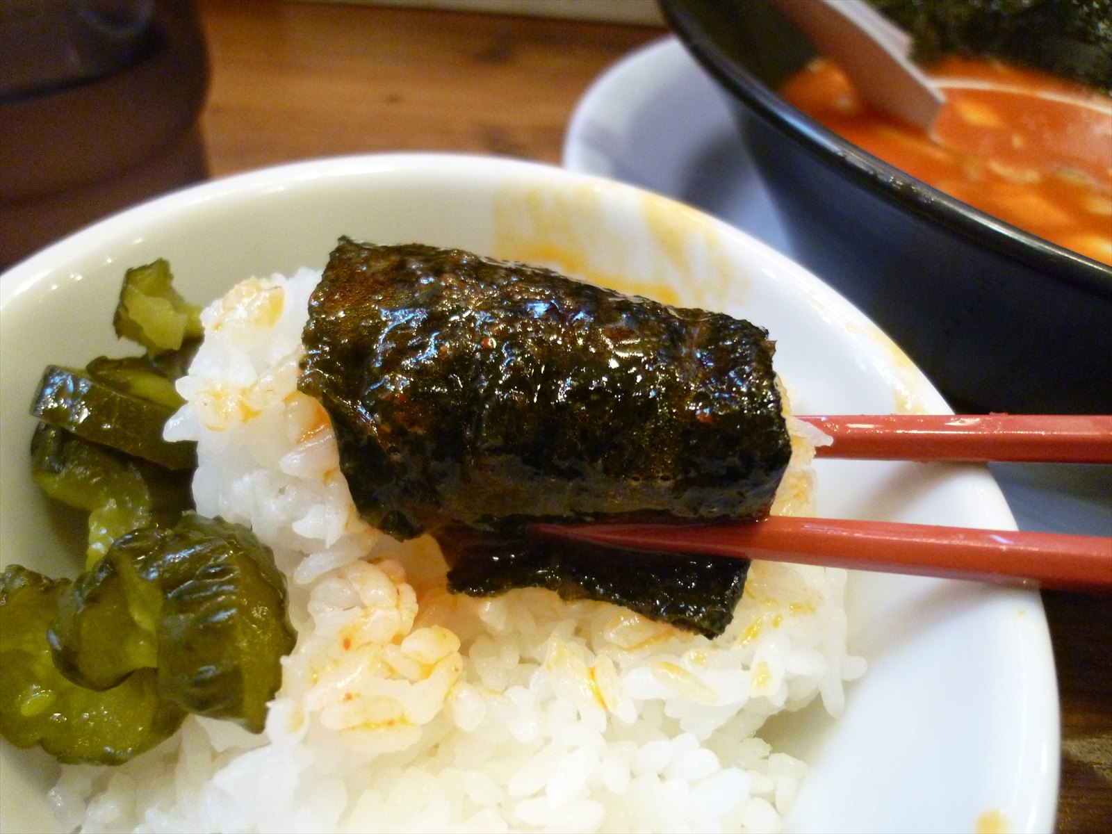 食べきれそうな量をよそってきゅうりの漬物も脇にのっけて。