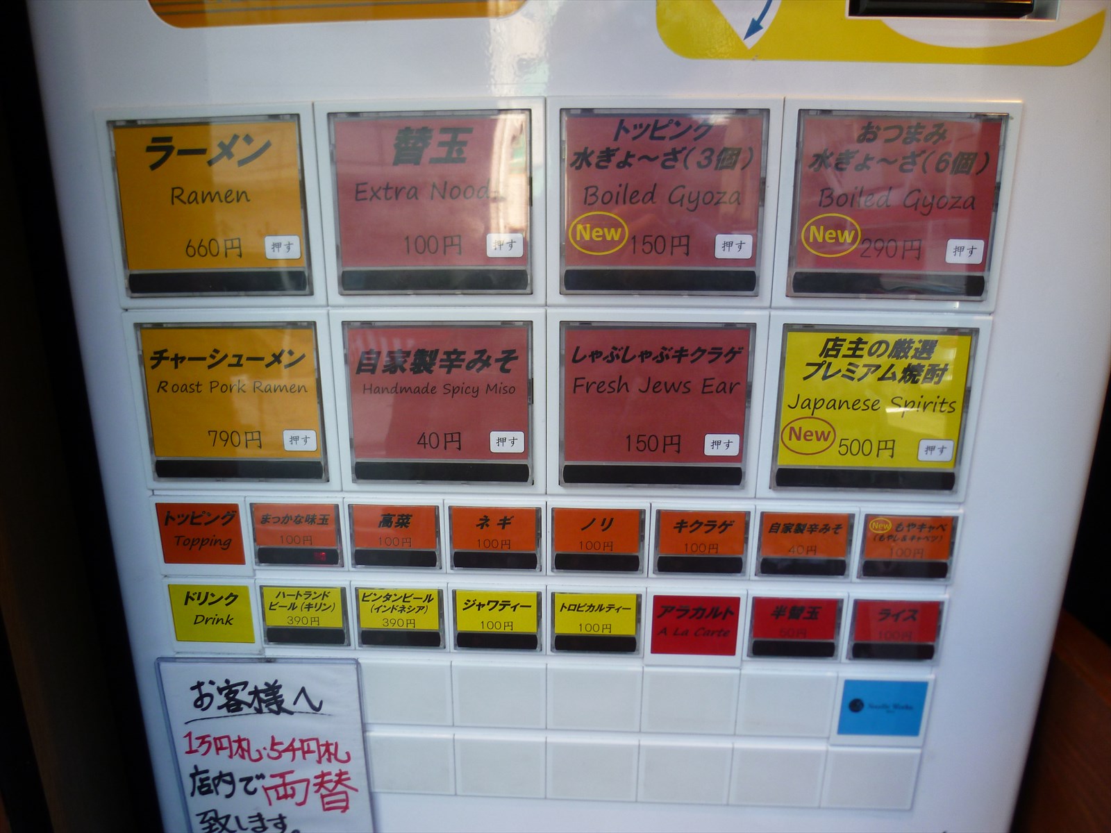 店外入口左にある券売機。とんこつラーメンに何をトッピングするかといった選択肢になります。