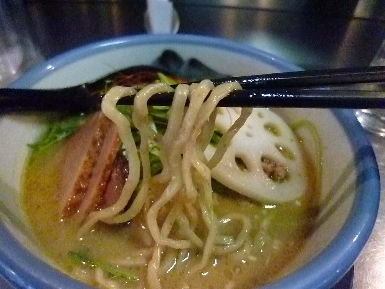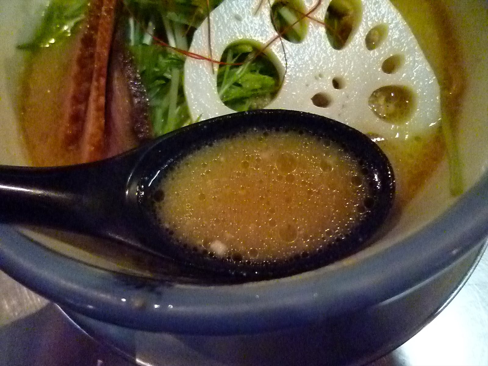ひときわ目を引く蓮根はシャキッと歯ごたえ。味付けはされてませんが素材の味が鮮やかで水菜や三つ葉とともにそれぞれ口直しに。焦がしをいれた深谷ネギも香ばしくとても甘く多彩な食感が楽しめるところに水菜の下からはけっこうな量のそぼろが出てきたりして食べごたえとスープの味に更なる力を加えてきます。