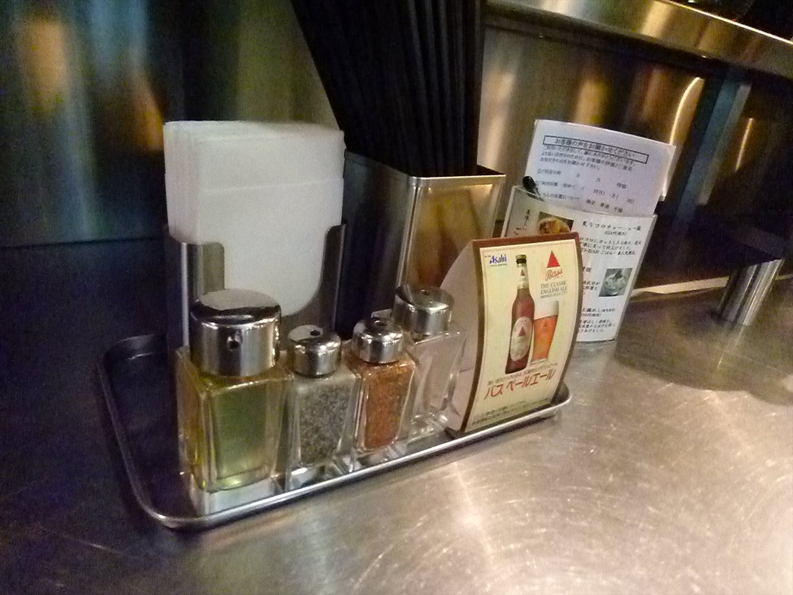 卓上調味料は胡椒にお酢と七味唐辛子。写ってませんがお冷やの美味しさも特筆ものです。