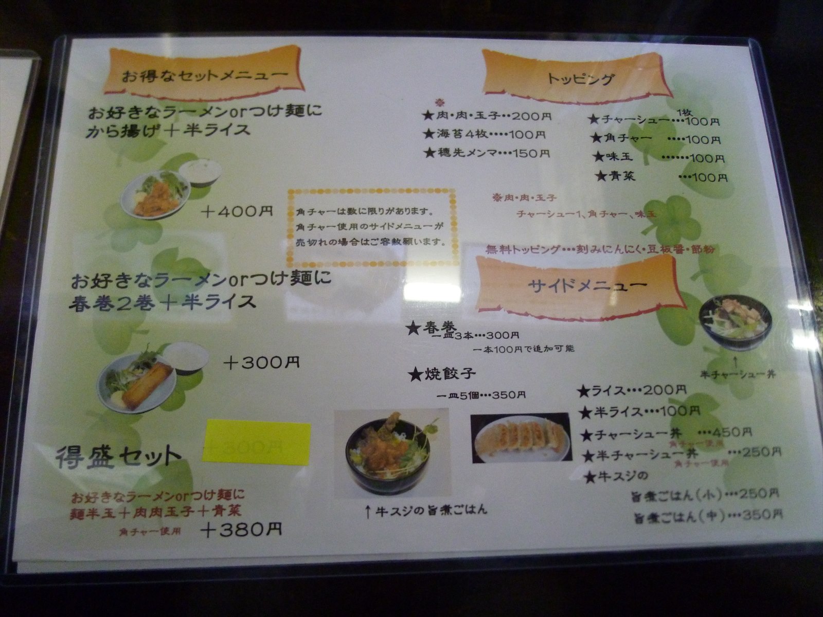 卓上にあるメニュー。昔ながら系鶏ガラ醤油からカレーまで大変多くの種類がありますが研究に余念がないようでコンプこそまだなものの今のところどれもが美味しくいただける印象を持っています。気分に応じて頼める汎用性の高さがありますね。