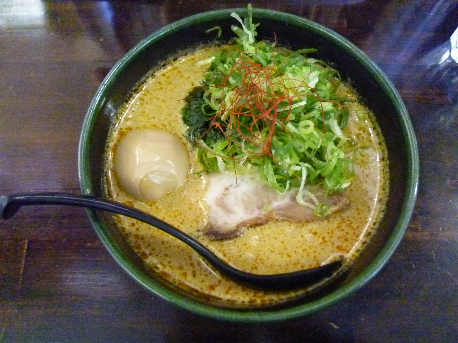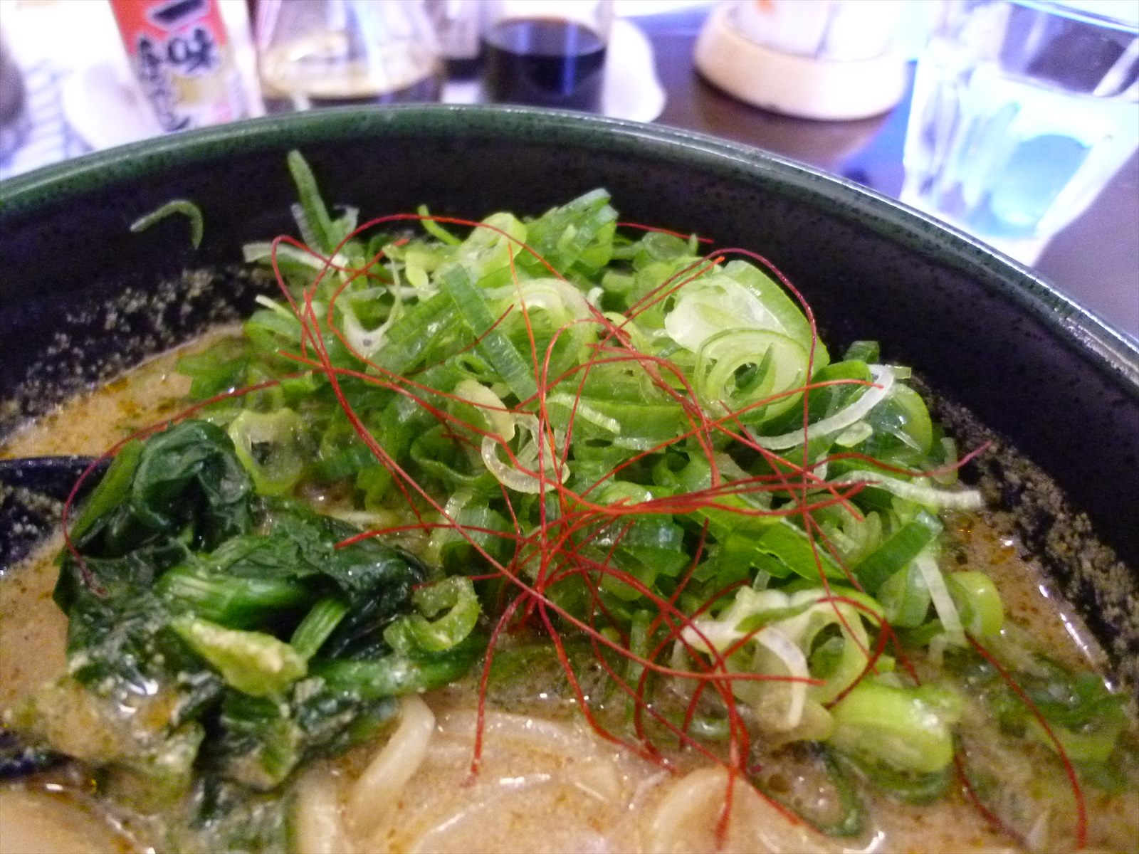 付け合わせにはほうれん草と薬味のネギに彩りの糸唐辛子。ネギ増し無料は前回になかったんで頼んでみましたが予想以上にたっぷりきちゃってちょっとびっくり。どのネギなのか分かりませんがネギ辛さはほとんどなくて瑞々しく混ざるごとに全体をさっぱりさせてくれました。