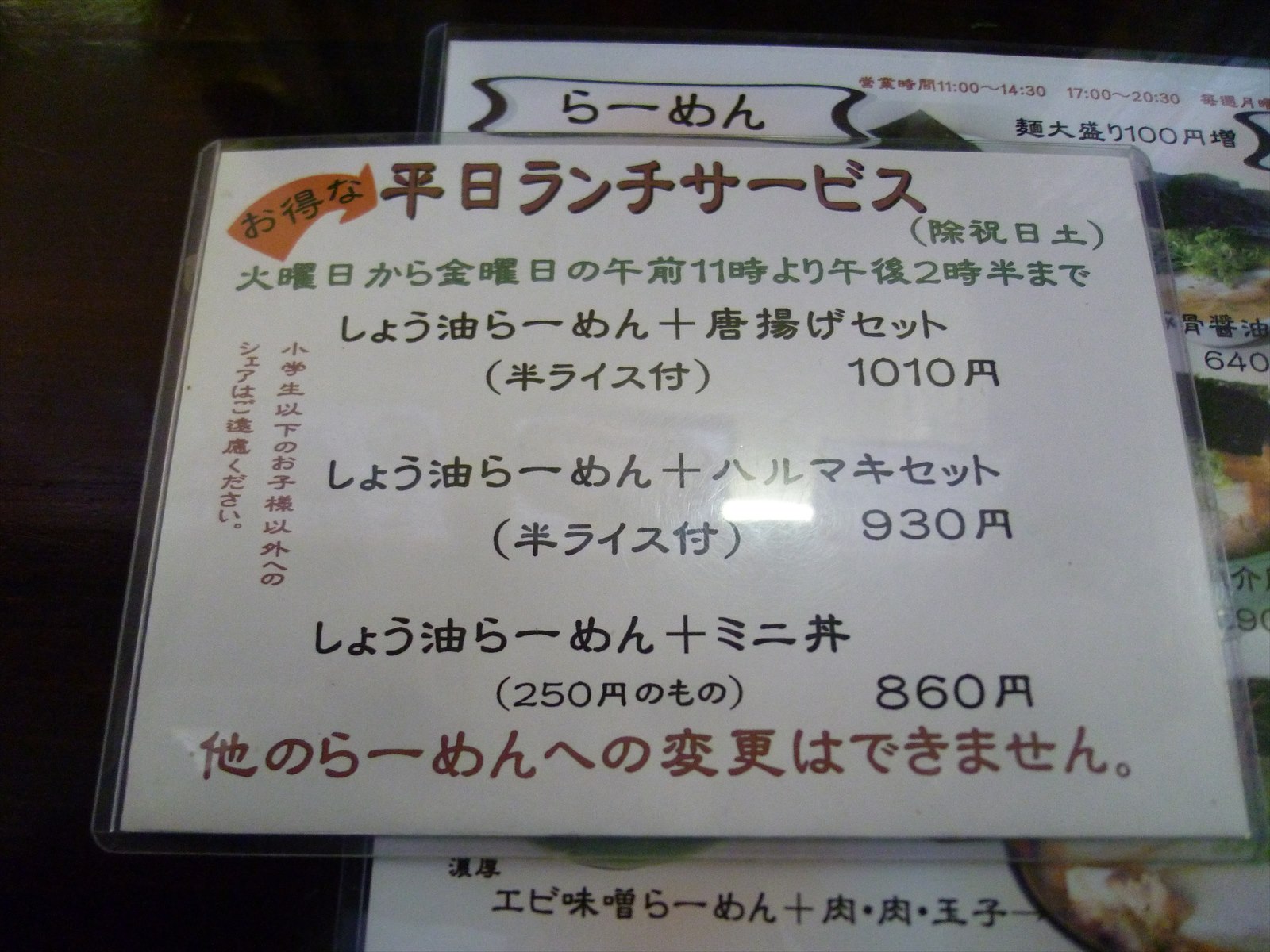 平日ランチタイムにはお得なセットも。しょう油らーめんは鶏ガラ醤油のことなのかな?