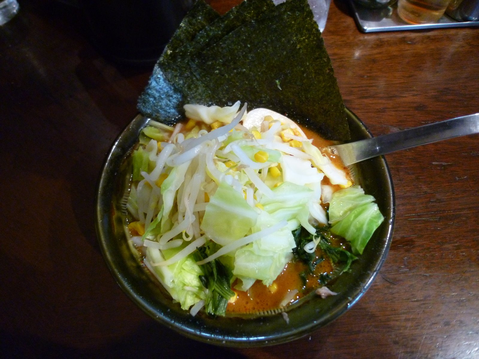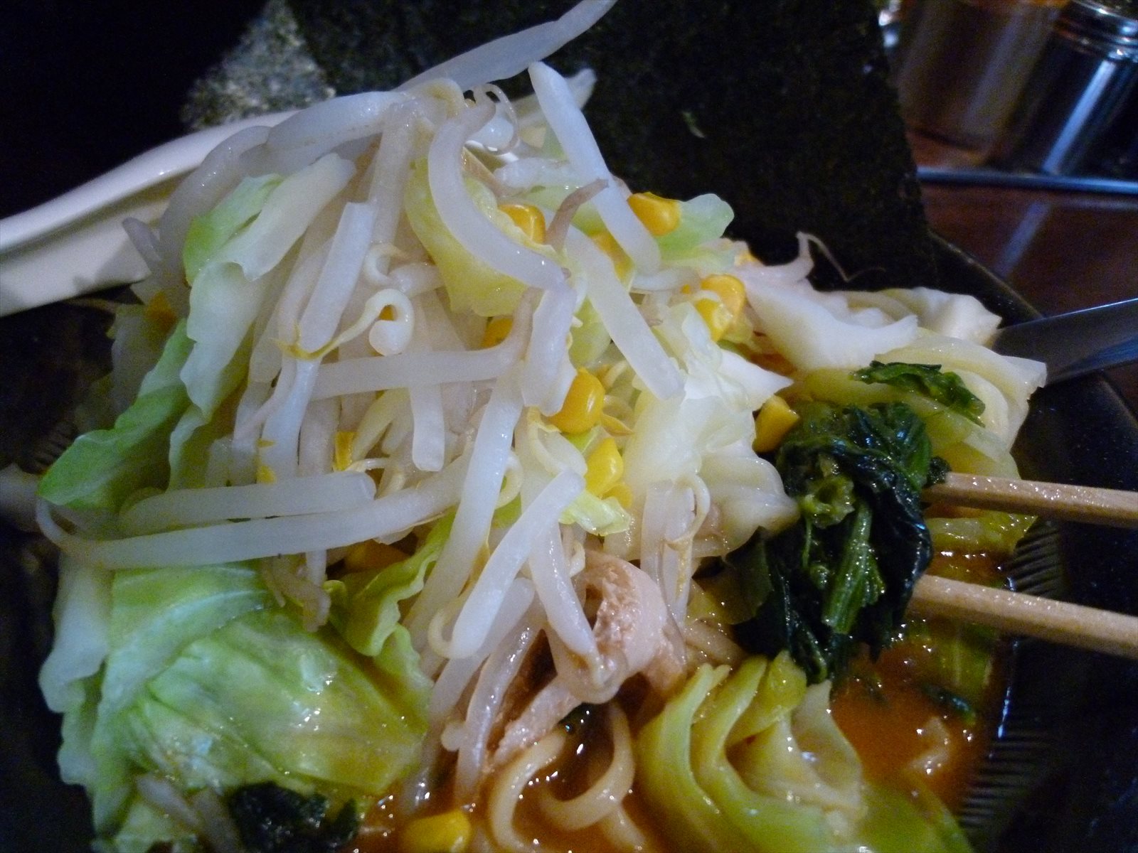 おそらく特製と謳ってる部分はたっぷりな茹でキャベツにコーンをまぶしたもやしの小山。それなりにボリューミーであり半生キャベツやぽきぽきなもやしとちょいちょいくるコーンの甘さが赤味噌のスープによく合います。もちろんほうれん草も入りますが存在感は希薄ですか。