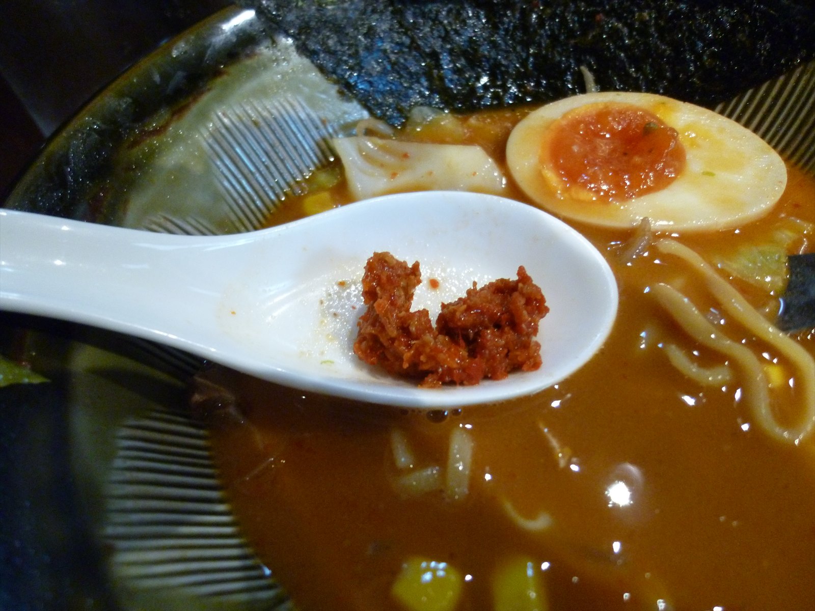 終盤には卓上の生粗挽き唐辛子をレンゲにとって溶き入れます。味噌感が強いこのスープには唐辛子が抜群に合いますね。辛ウマじんわりぽっかぽかでご馳走様です。