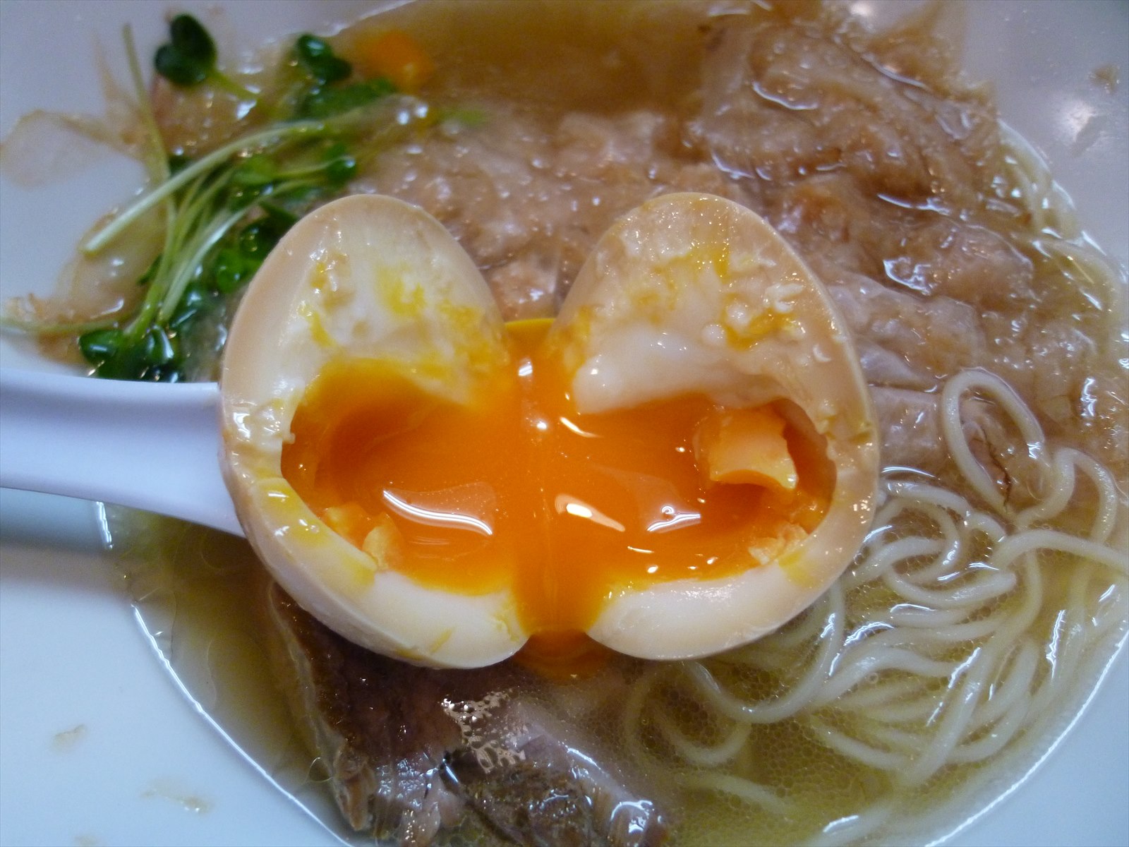 味玉はとろけだす半熟加減に淡い味付け。玉子の味が濃くごはんの上で割って醤油をたらせば至高のウマさになりそうですが卓上から醤油がなくなっちゃってんだった。