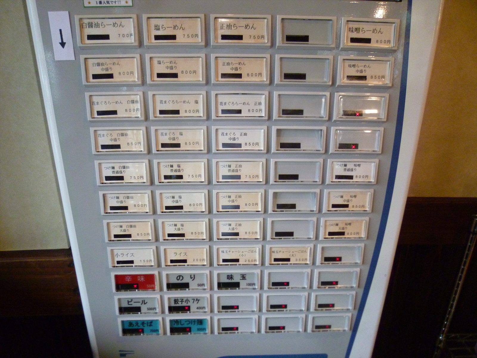 入って左にある券売機。フラッグシップの白醤油をトップに塩・正油・味噌と基本的に縦の配列につけ麺やあえそばなどは中央より下。画像は前回の使いまわしなんですが餃子がなくなってました。