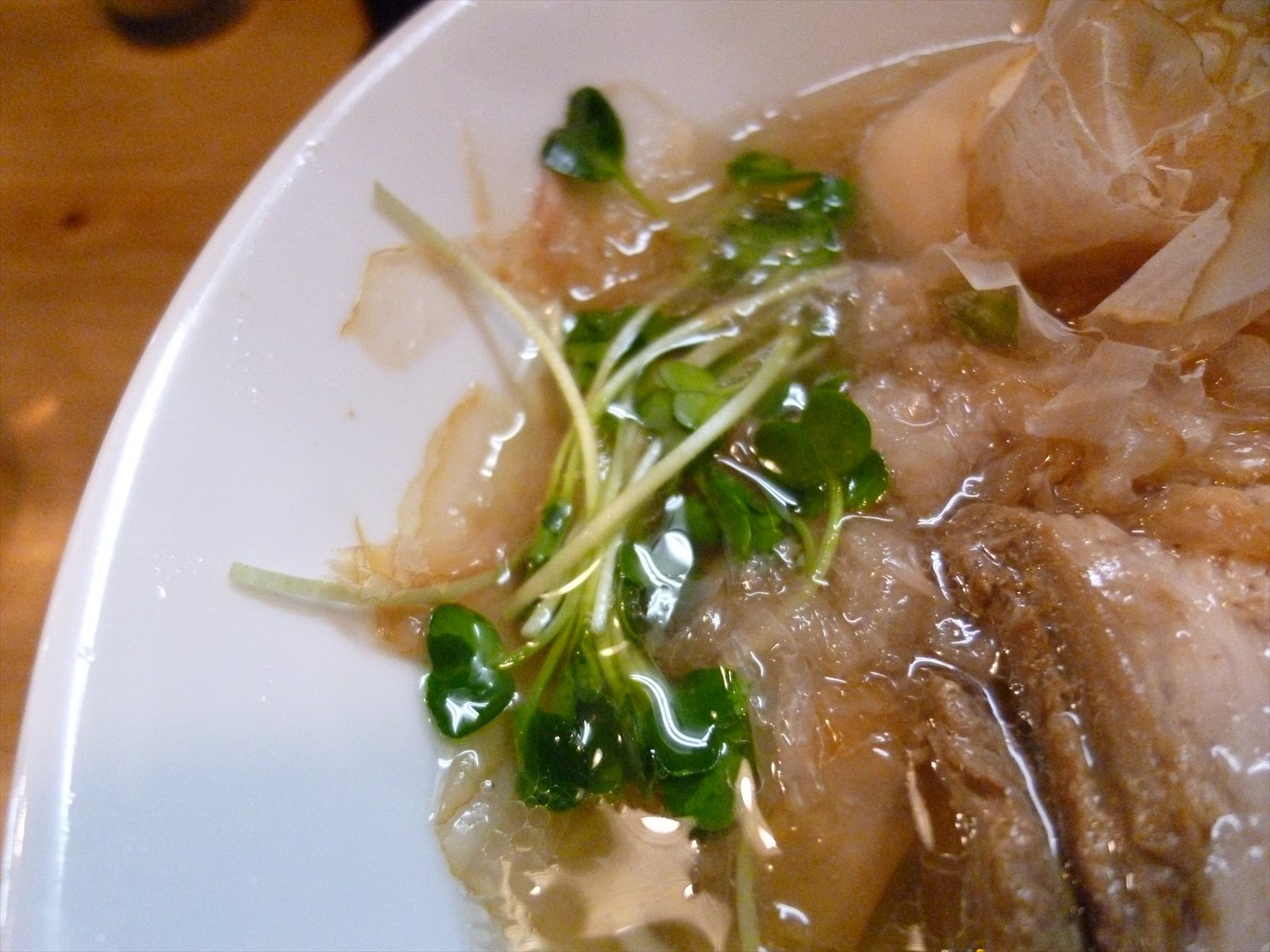口直しにはカイワレが少々。修行元もカイワレだったしこれはこれで良いんですが店頭のメニュー写真はたっぷり水菜で掲示されてるんでちょっと違和感がありました。花まぐろ節はこれでもかって追いダシ効果にそれ自身が旨みをガンガン出し続ける具としての役割りもあったりして。