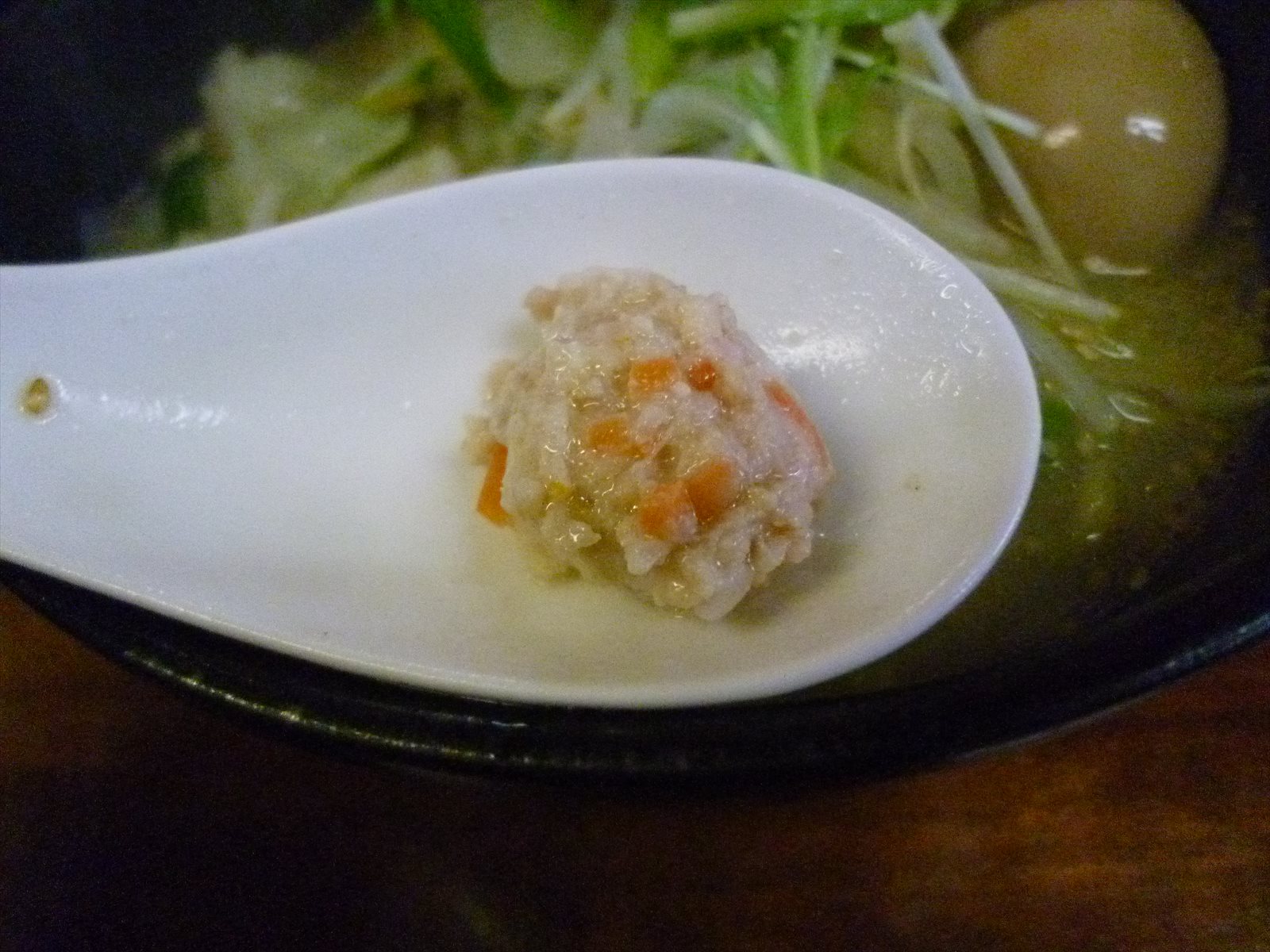 この1杯にチャーシューは入らず代わりに入るは後述の炒め野菜からふんだんに出てくる鶏団子。粗挽きというよりたたきぐらいに肉の食感を残した鶏団子は鶏肉のウマさたっぷりに柚子の風味が鮮やかでニンジンなの?って甘さもあったりしてすっげえうめえ。