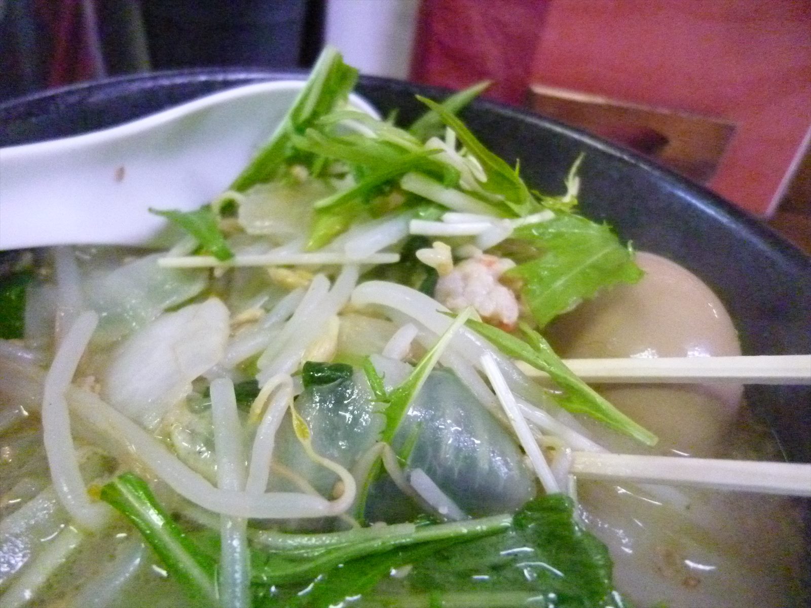 具には前述の鶏団子を含めてさっと炒めたもやしに玉ねぎ。水菜が生の食感を演出したりで野菜の使い方の面白さを楽しむこともできました。これはありそうでないかもしれない。