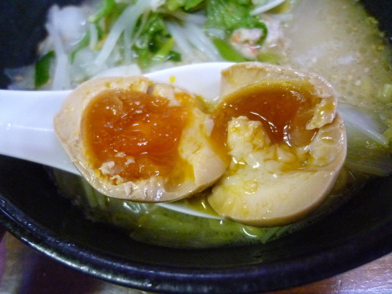 味玉は濃いめな醤油の味付けにとろとろ黄身の半熟加減。黄身の大きさが尋常でない気がしますがどこの玉子なんだっけ?