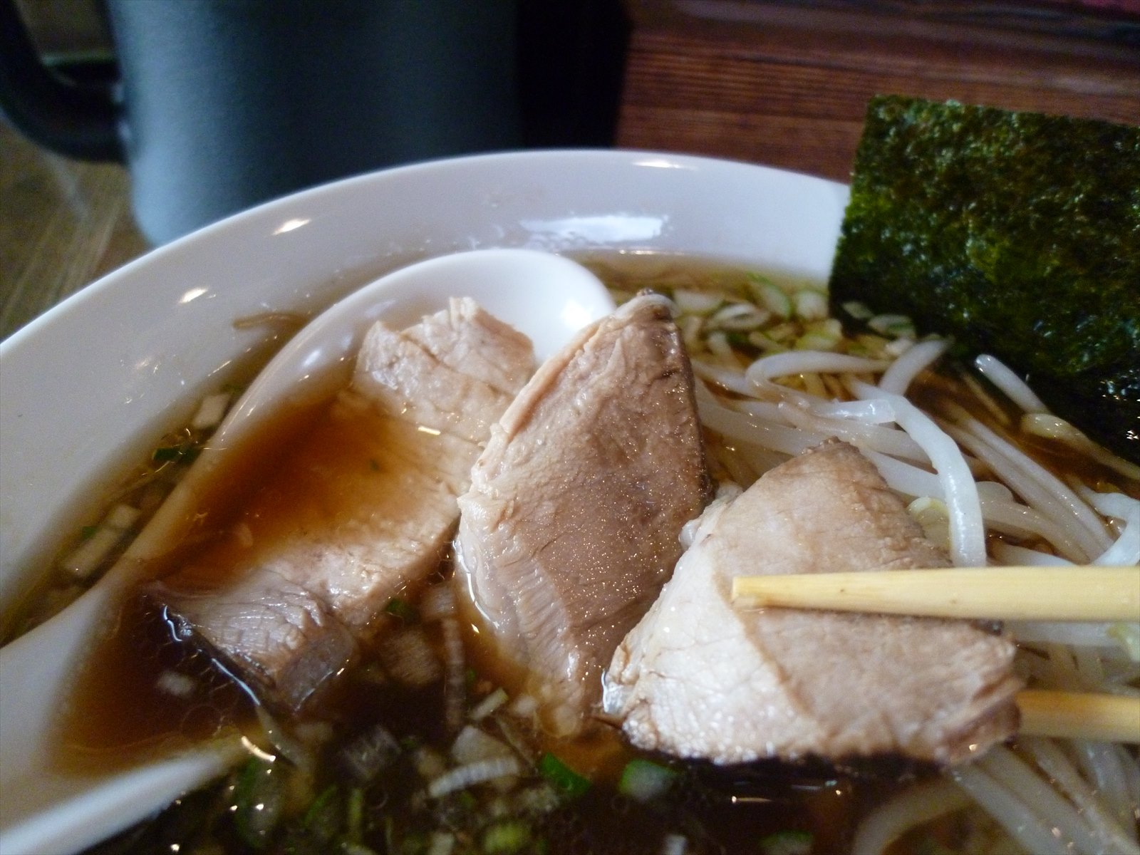 チャーシューは小ぶりながら厚みのあるのが3つ。歯ごたえしっかり味付けしっかりで柔らかくはありませんが肉の旨みがたっぷりで噛むごとに美味なやつで。