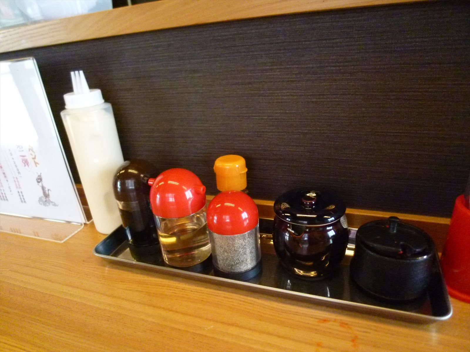 家系標準であれば、おろしニンニク、おろし生姜、刻み生姜、豆板醤でしょうから、容器の数が足りないな。