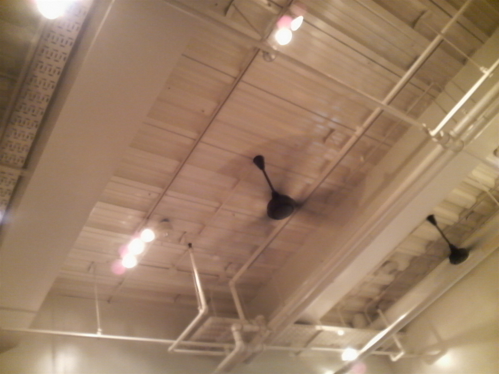 開放感のある高天井にはファンが3基回っています。