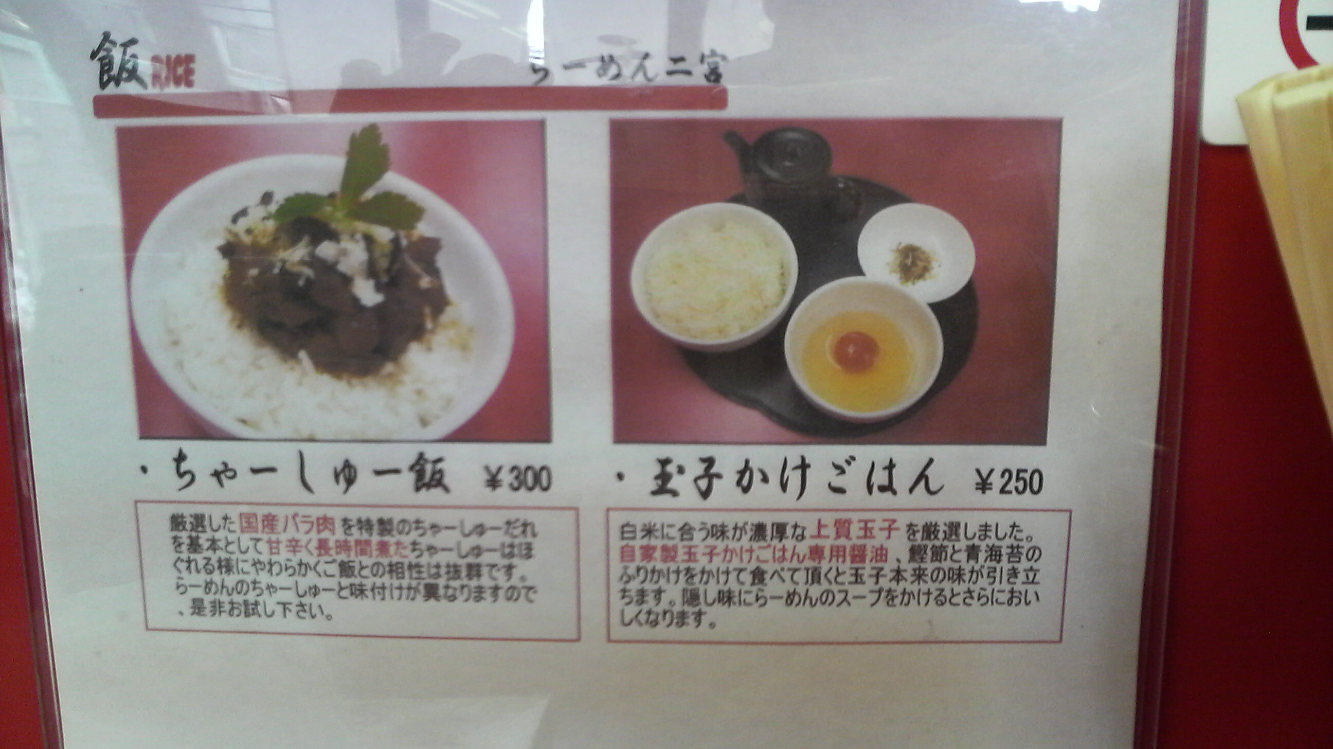 ご飯メニューです。玉子かけご飯ってのは珍しいですね。ラーメンには合うのかな?