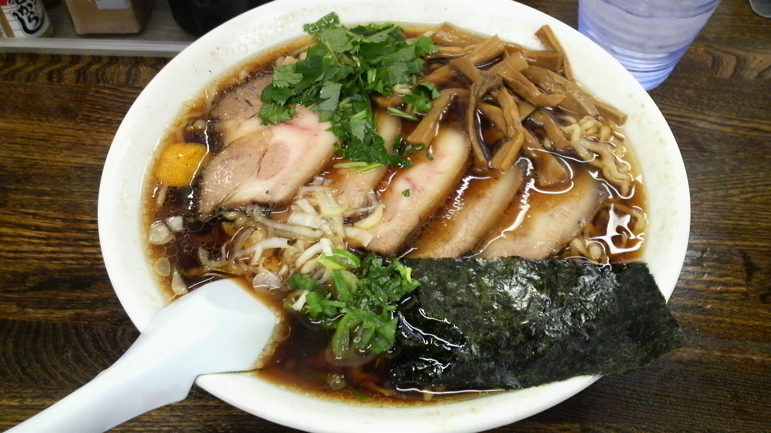 スープの味は動物系のダシが強く、真っ黒い見た目通りに正油が前に出てます。
