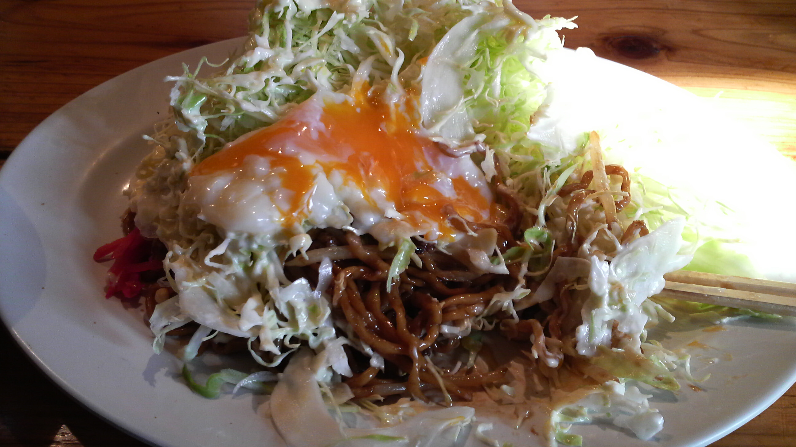 最初はキャベツと麺を別々に、ある程度食ったら混ぜながら、更に進んだらこんな風に上の温玉を崩して食うと飽きずに