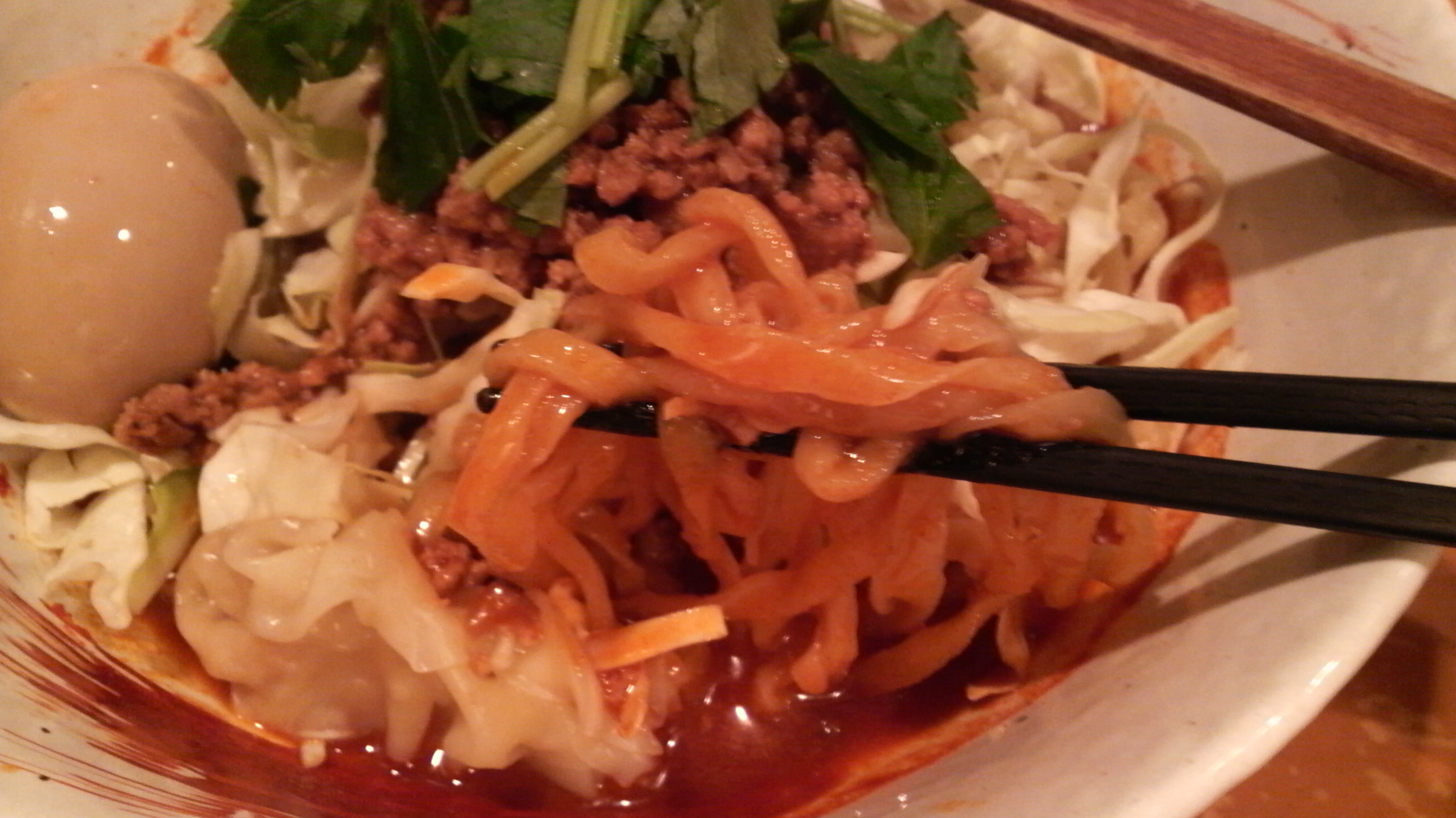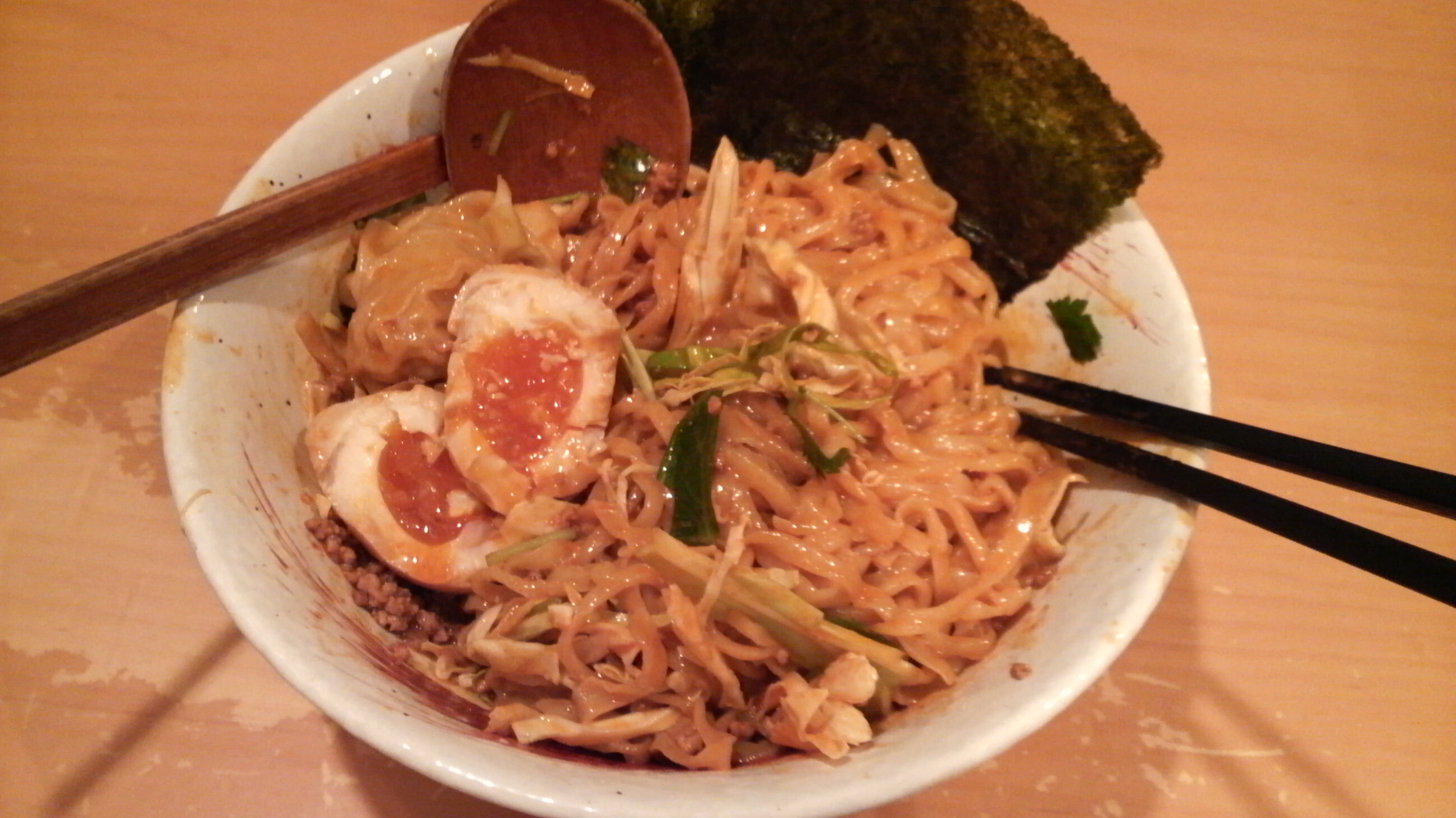 5番で頼んだ俺がいけないんですが、ラー油麺になってました。正直ちょっとニガテかな〜。