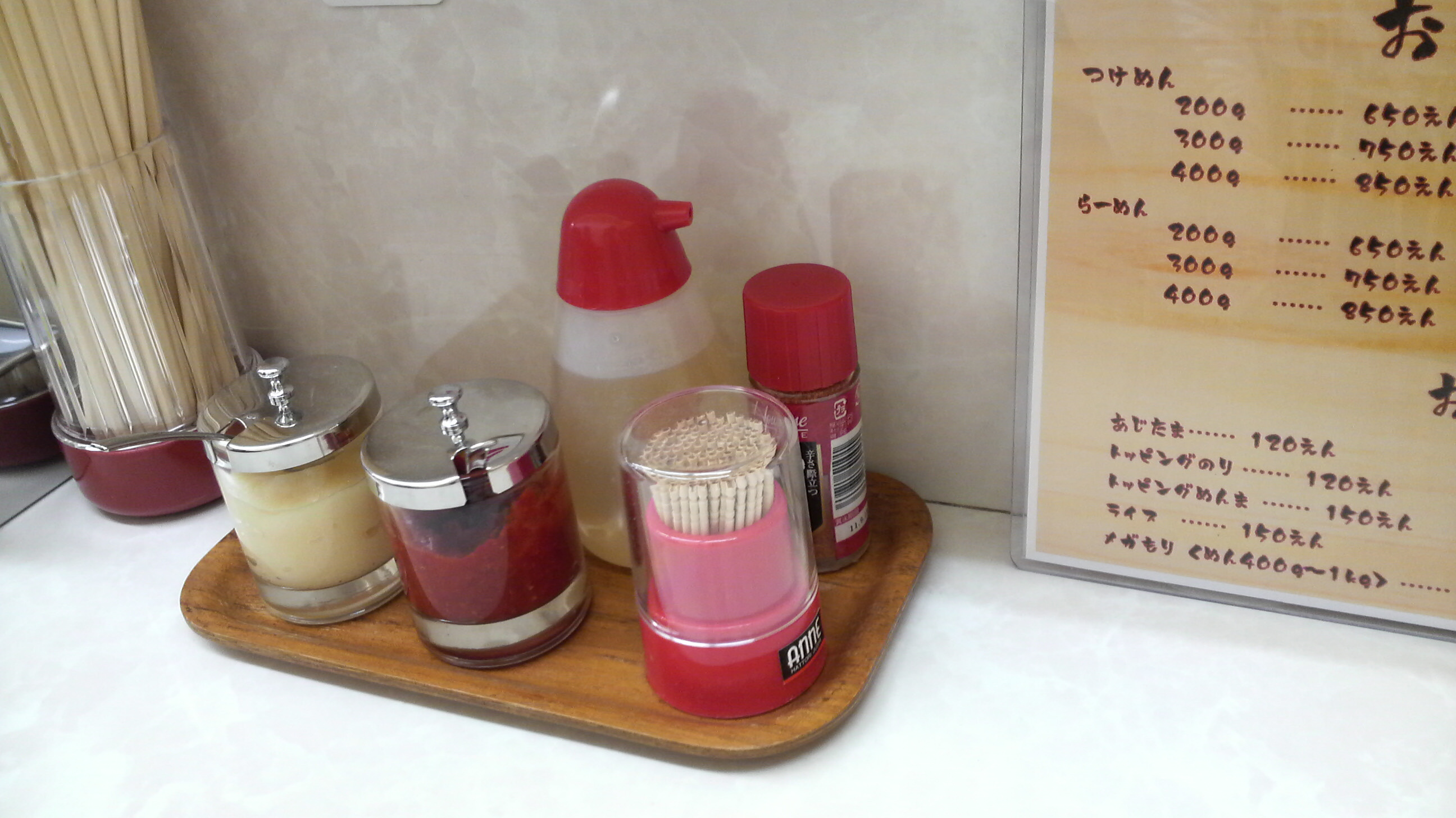 卓上の調味料は酢、七味、ニンニク、豆板醤、写ってませんが胡椒もあります。