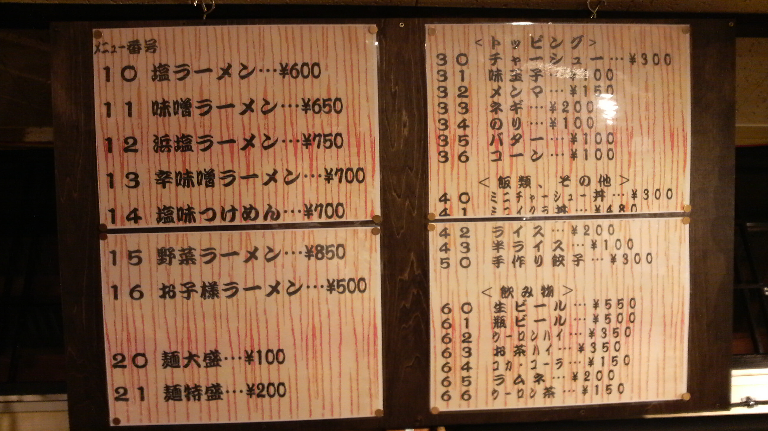 で、どの番号を入力するかというと。券売機の上に番号の入ったメニューがあります。