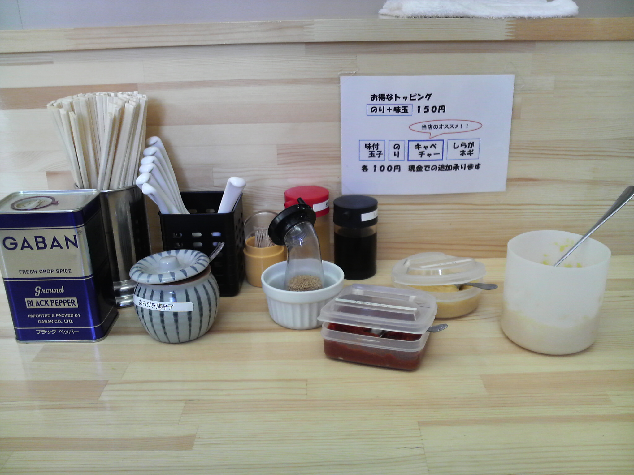 店内にはまだ開店祝いが貼ってあります。古巣の六角家の他、厚木の梅家からのもありました。卓上にはモロモロの調味料があります。