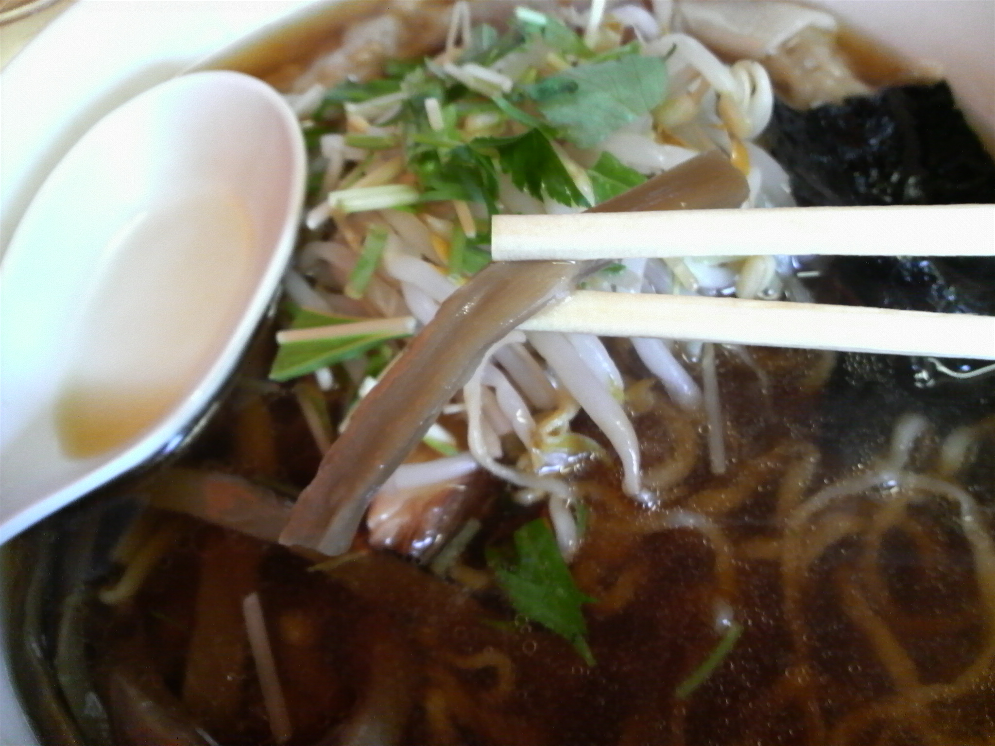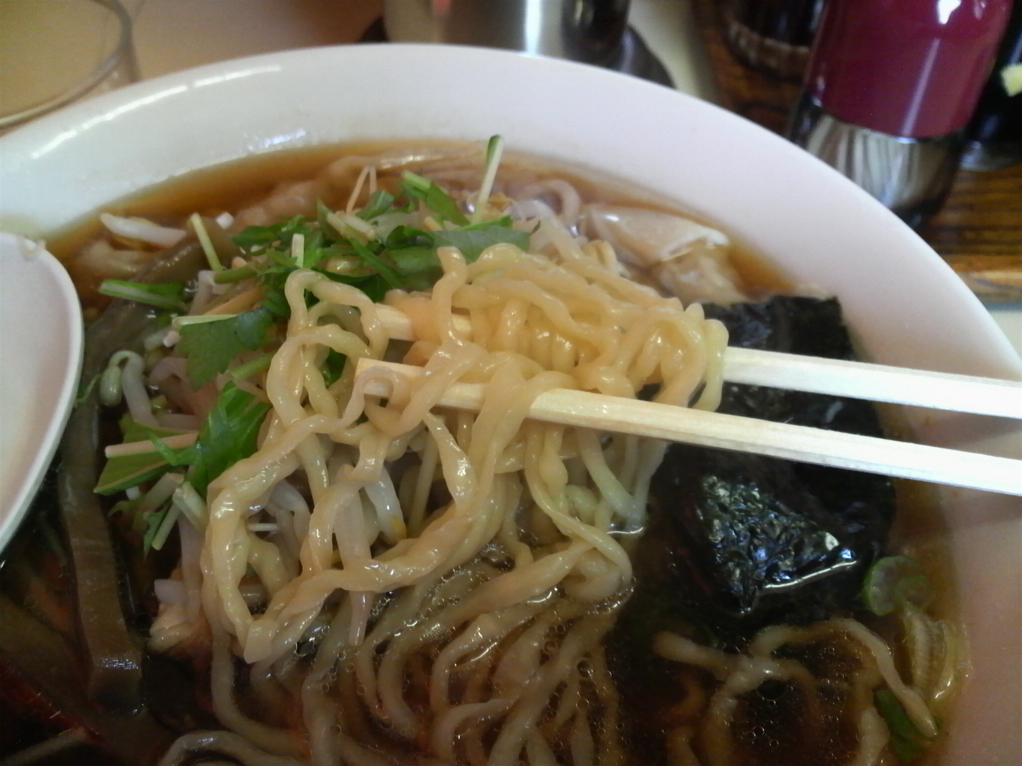 醤油こそ濃ゆいものの昔ながらのあっさりと優しい味に思えました。麺は強く縮れた平打ちの中麺。