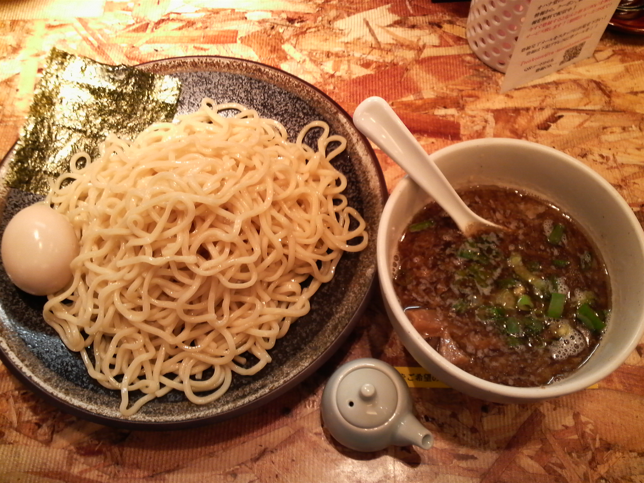 前回は新メニュー、魚介とんこつつけ麺に魚介ダシ入り味玉子をトッピングして食べてます。